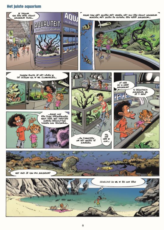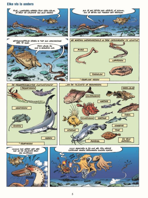 Wist je dat er zeven soorten zeeschildpadden bestaan? Dat dolfijnen net als mensen een zeer sterke band met elkaar hebben? Dat sommige schelpdieren net als termieten hout eten? En dat de Spaanse danseres een naaktslak is uit de Indische Oceaan? Tuurlijk ... tenminste àls je diep in de zee woont. Doe je dat niet, houd dan je duikbril en snorkel klaar en ontdek de wondere onderwaterwereld in deze grappige strip. Een grappige, fascinerende én leerrijke reeks over alle dieren die in het water leven. Gags met hier en daar een handige steekkaart. Het magnifieke tekenwerk geeft de diepzeebewoners een eigen smoel.