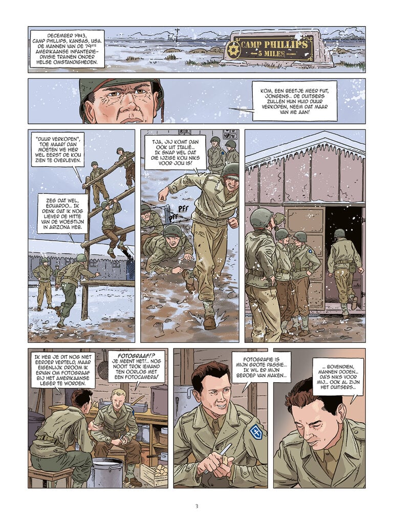 D-day. De grootste militaire operatie van de Tweede Wereldoorlog! Eind 1943 wordt de Amerikaanse 79th Infantry Division klaargestoomd in Camp Phillips, Kansas. Eduardo en Frank zijn er niet erg gerust op, want er wordt getraind met echte kogels... Zes maanden later in Plymouth, tijdens de overtocht naar Frankrijk, houdt Eduardo een camera tussen zijn vingers geklemd. Alsof hij zich vastklampt aan de baan van zijn dromen, terwijl hij door het brandende Europa zwerft... Op 14 juni, na te zijn geland op Utah Beach, maken de twee vrienden zich gereed om naar de Noord-Cotentin op te trekken en het 'fort' van Cherbourg in te nemen: Hitlers Festung... Normandië, juni '44 is een reeks van 10 delen. Ieder album bevat een uitvoerig historisch dossier.