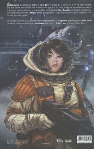 Docteur Aphra est contrainte d'obéir à Triple Zéro, le druide qui la servait il y a encore peu de temps. Elle doit mener une mission pour le compte du syndicat du crime, dirigé par le druide meurtrier, et infiltrer une base rebelle sous la responsabilité de la Générale Hera Syndulla. Ce faisant, l'archéologue criminelle sera confrontée à Magna Tolvan, une agente de l'Empire qui la traque depuis longtemps pour de bien obscures raisons... Ce deuxième volume des aventures d'Aphra est scénarisé par Si Spurner (Legion of X) et Kieron Gillen (Immortal X-Men), et dessiné par Kev Walker (Predator) et Emilio Laiso (Amazing Spider-Man).