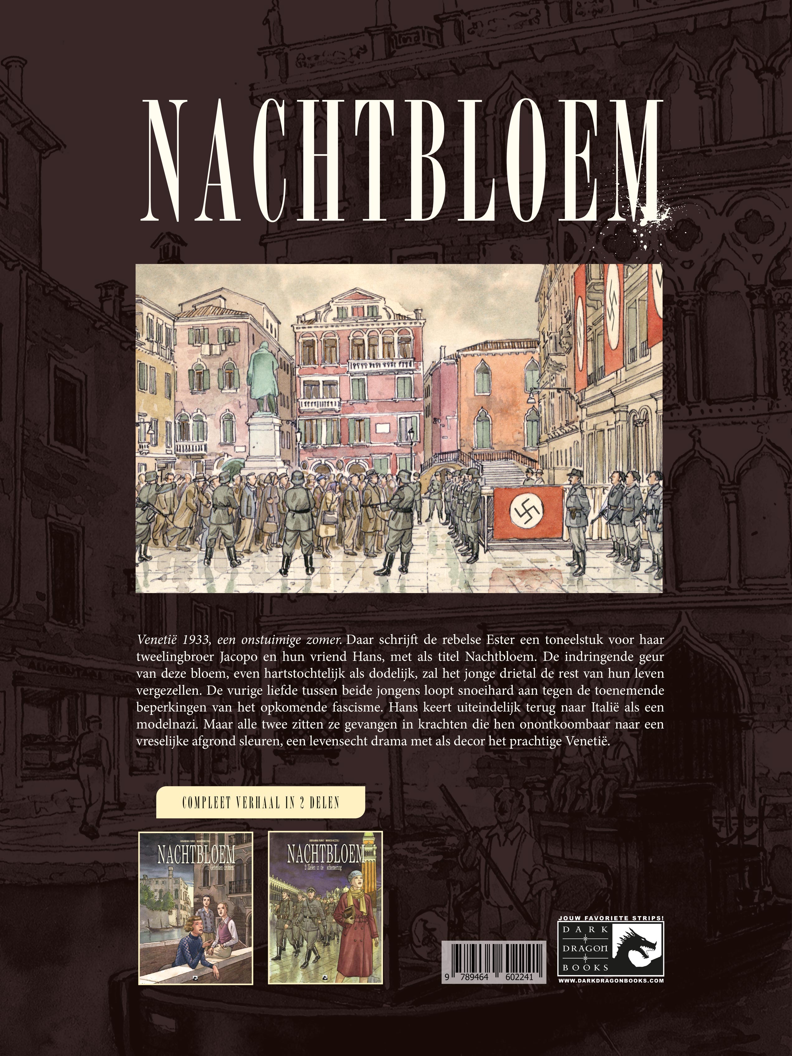 deel 2/2 Een verboden liefdesverhaal in het hart van het fascistische Italië. Zomer 1933, Venetië. Een meisje en twee jongens. Hans en Jacopo behoren beiden tot de elite, maar hun liefde wordt tegengewerkt door de politieke kampen waartoe hun families behoren. Jacobo is joods. Hans een vertegenwoordiger van het nazisme in Italië. Hoe kan hun relatie de culturele, sociale en politieke veranderingen van die tijd overleven? Een duister, elegant tweeluik, Nachtbloem gaat over een van de donkerste periodes in de geschiedenis door de roze bril van verboden liefde. Een menselijke tragedie over de tegengestelde kanten van de ziel: verraad & trouw, vreemdelingenhaat & idealisme, zuiverheid & gemeenheid, jaloezie & zelfverloochening...