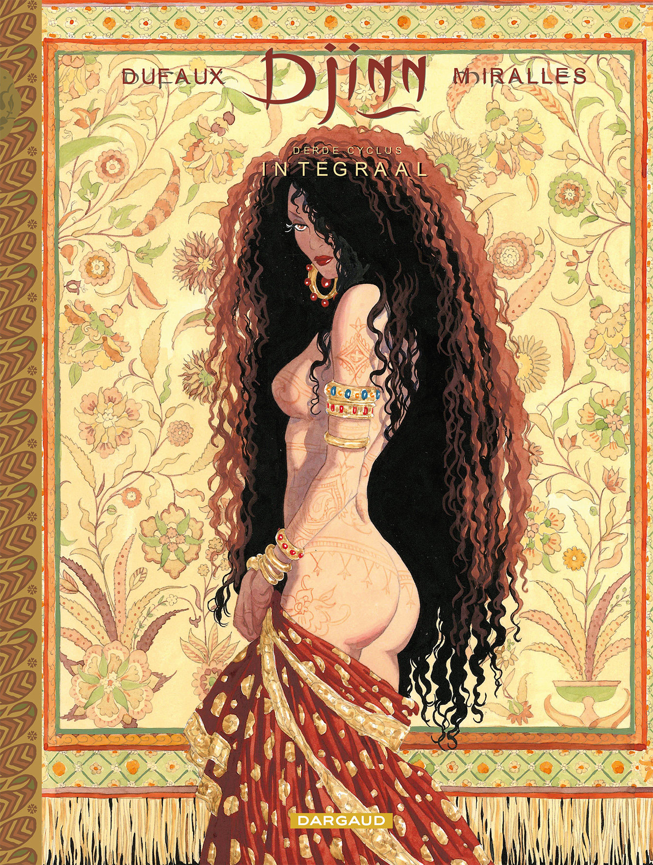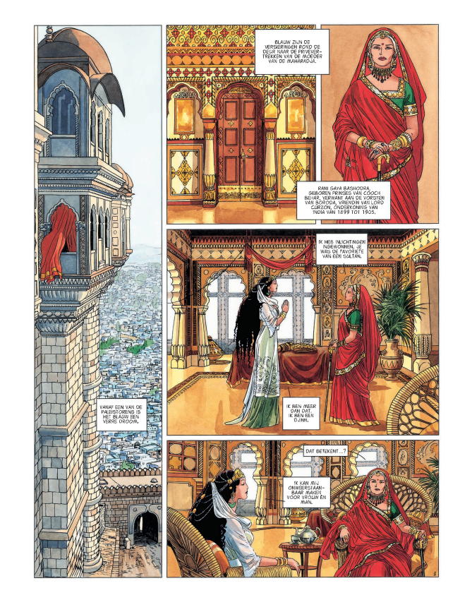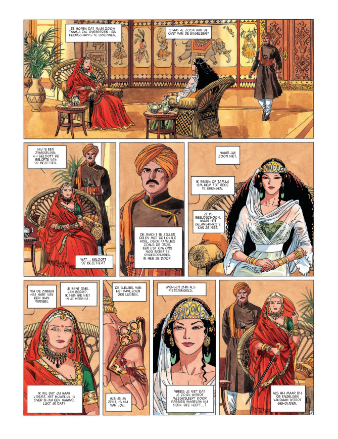 integrale uitgave Deze laatste integrale bundelt de Indische cyclus met de delen 10 tot 13. Tegen de achtergrond van de Engelse koloniale bezetting zijn Jade en de Nelsons te gast bij de Rani van Eschnapur, de moeder van de Maharadja die op het punt staat te trouwen. De Rani doet een beroep op de liefdesvaardigheden van Jade om de jonge bruid, de dochter van een anti-Engelse revolutionair, te leren hoe zij haar toekomstige echtgenoot, die de Engelsen gunstig gezind is, kan betoveren en manipuleren. Maar Jade ontdekt dat er een onsterfelijke vloek over het paleis en de koninklijke familie hangt. Met een genadeloze invloedsoorlog en een intrigerende schattenjacht wordt in deze laatste cyclus Kim Nelsons zoektocht naar haar oorsprong afgesloten en gelijktijdig ook een adembenemende saga van mysterie en sensualiteit. Ana Mirallès tekent fantastische vechtscènes - Bevat Het paviljoen der lusten, Een eeuwige jeugd, Hervonden eer en Kim Nelson Striptekenares Ana Mirallès ( Spanje, °1959) tekende ook nog deze stripreeksen • Mano en Mano Muraqqa Op zoek naar de eenhoorn Scenarist Dufaux is een befaamd stripscenarist die reeds menig stripverhaal schreef waaronder deze ganse lijst • Foucauld Barracuda Betoveringen Blake en Mortimer Conquistador Dakota De Aasgieren > De Klaagzang van de verloren gewesten De Rochesters De Rode Keizerin Rovers van Keizerrijken Dixie Road Djinn Dubbel Masker Een Koning zonder verstrooiing Fox Giacomo C Het Maagdenbos Het pad van Jessica Jessica Blandy Kruistocht Leren Masker Medina Mister BLack Murena Niklos Koda Regenwolf Nomade Saga Valta Saria Schimmenspel The Dream Venus H Vincent