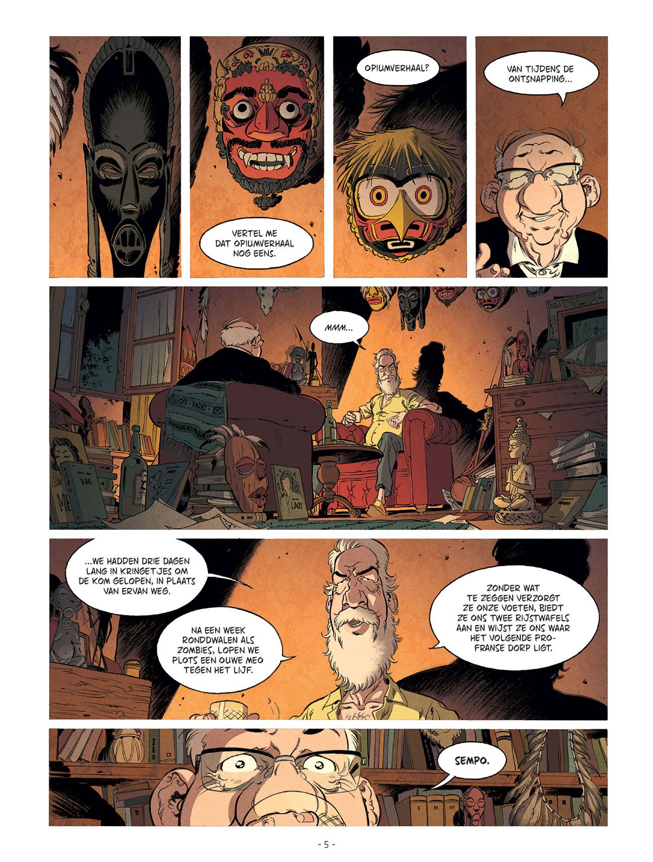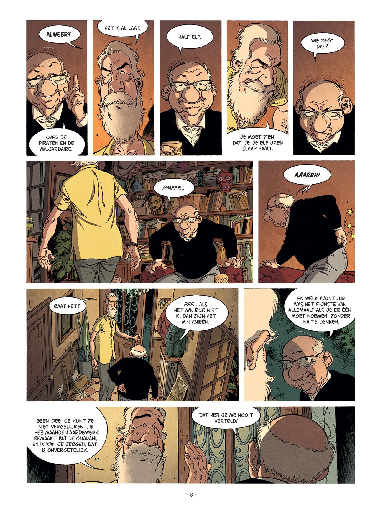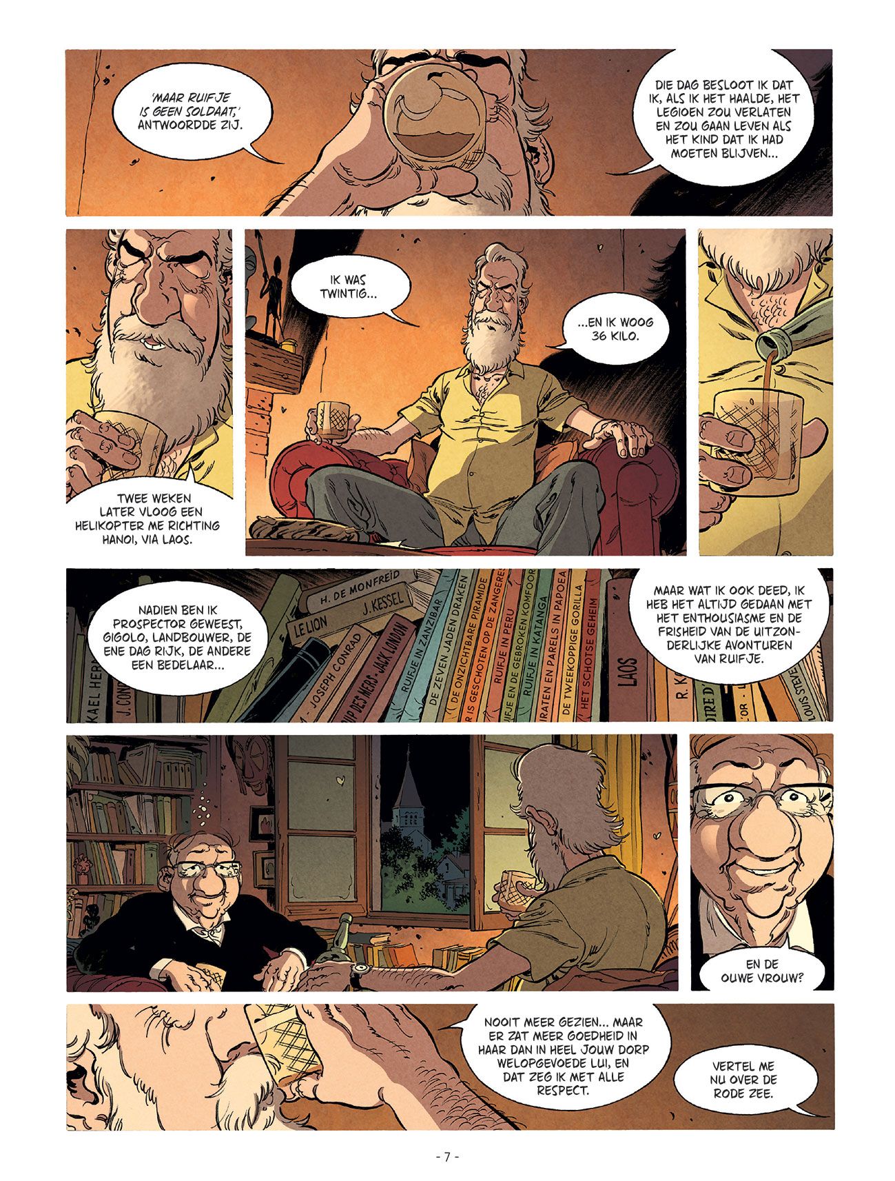 Joseph Seigneur is geboren in Antananarivo. Jawel, de hoofdstad van Madagaskar. Maar als je dat niet gelooft, dan maakt hij zijn gebuur Amedée - een gepensioneerde notaris - wel wat anders wijs. Zo'n avontuurlijk leven had Amedée Petit-Jean ook wel willen beleven. Liever fantaseren bij zijn buurman dan te moeten luisteren naar het gezaag van zijn echtgenote Françoise. Maar Jo krijgt een fatale hartaanval. Wat nu met de peperdure verzameling 'Ruifje' strips? We zien o.a. 'Ruifje en de gebroken komfoor'. Maar op p. 26 merken we dat de vertaling van de striptitels soms wordt vergeten. Amedée besluit op zoek te gaan naar familieleden en uit te zoeken wie de erfgenamen zijn. Hij vertrekt op avontuur. Het wordt een ontroerende en grappige roadtrip met een Spitfire Triumph mk2. Maar dan ontdekt Amedée de eerste barstjes in de verhalen van Jo. Hij blijkt geboren te zijn in Charville (12-4-1934) en was een vertegenwoordiger in stofzuigers... Joseph M'Bo wordt uiteindelijk gevonden, maar de collectie Ruifjes leveren maar vijf euro per stuk op. Wat gezelschap is veel meer waard! Auteur Eacersall laat Jacques Brel ook de dromers bezingen. De laatste woorden: "J'arrive" (in de Franse uitgave) zijn duidelijk een verwijzing naar één van zijn liedjes (1968). Mark Eacersall kennen we nog niet zo goed, maar wist toch al een prijs (Fauve Polar 2021) te pakken op het stripfestival van Angoulême met GoSt111 (samen met Henri Scala en Marion Mousse). De platen zonder woorden zijn natuurlijk ook geschreven door Eacersall. Als lezer kan je die stilte opvullen met verbeelding. Sylvain Vallée is geen onbekende voor ons: Spoorloos, Gil St. André, Er was eens, Katanga.