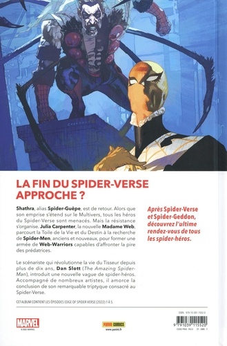 L'avenir du Spider-Verse se dessine... et il est loin d'être joyeux ! Les plus grands Spider-héros du Multivers se mobilisent, ce qui nous donne l'occasion de découvrir de nouvelles têtes. On fait ainsi la connaissance de l'étonnant Spider-Rex, de la nouvelle Spider-UK, du minuscule Mini-Spidey, du mystérieux Night-Spider et de bien d'autres qui n'attendent que de se présenter. Les plus grands scénaristes et dessinateurs de Marvel s'amusent à inventer de nouvelles versions de Spider-Man, alors que Spider-Man : Across the Spider-Verse a envahi les cinémas. Parmi eux, les incontournables Dan Slott (Superior Spider-Man), Mark Bagley (Ultimate Spider-Man) ou encore Paco Medina (Deadpool), mais aussi Phil Lord et Chris Miller, qui ont imaginé les aventures de Miles Morales sur grand écran !
