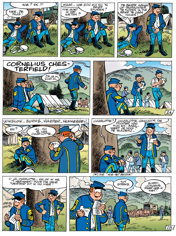 Kapitein Stark is een groot strateeg. Dat weten de fans van De Blauwbloezen na vijftig delen maar al te goed. En hij is een man van weinig woorden. 'Aaaanvalleueueueuh' betekent voor hem alles en dat zal de tegenstander geweten hebben. Wat we nog niet wisten, is dat vader Stark voor zoonlief een carrière als kleermaker weggelegd zag. Een prachtig plan waar de secessieoorlog helaas een stokje voor stak. De laatste slag waarin de 22ste cavalerie was betrokken, is voor kapitein Stark de slag te veel geweest. Hij sluit zich op in een zorgwekkend mutisme. Om hem weer aan de praat te krijgen, zal zijn hoofd eerst even helemaal leeggemaakt moeten worden. Blutch en Chesterfield zijn ontroerd wanneer ze horen over het verleden van Stark en besluiten de man te helpen. Maar het resultaat van hun interventie is verrassend: Stark neemt ontslag uit het leger en wil weer gaan naaien. Die morele blaam kan generaal Chesterfield niet over zijn kant laten gaan. Chesterfield en Blutch moeten ervoor zorgen dat de kapitein zich bedenkt ... Anders wacht het vuurpeloton!
