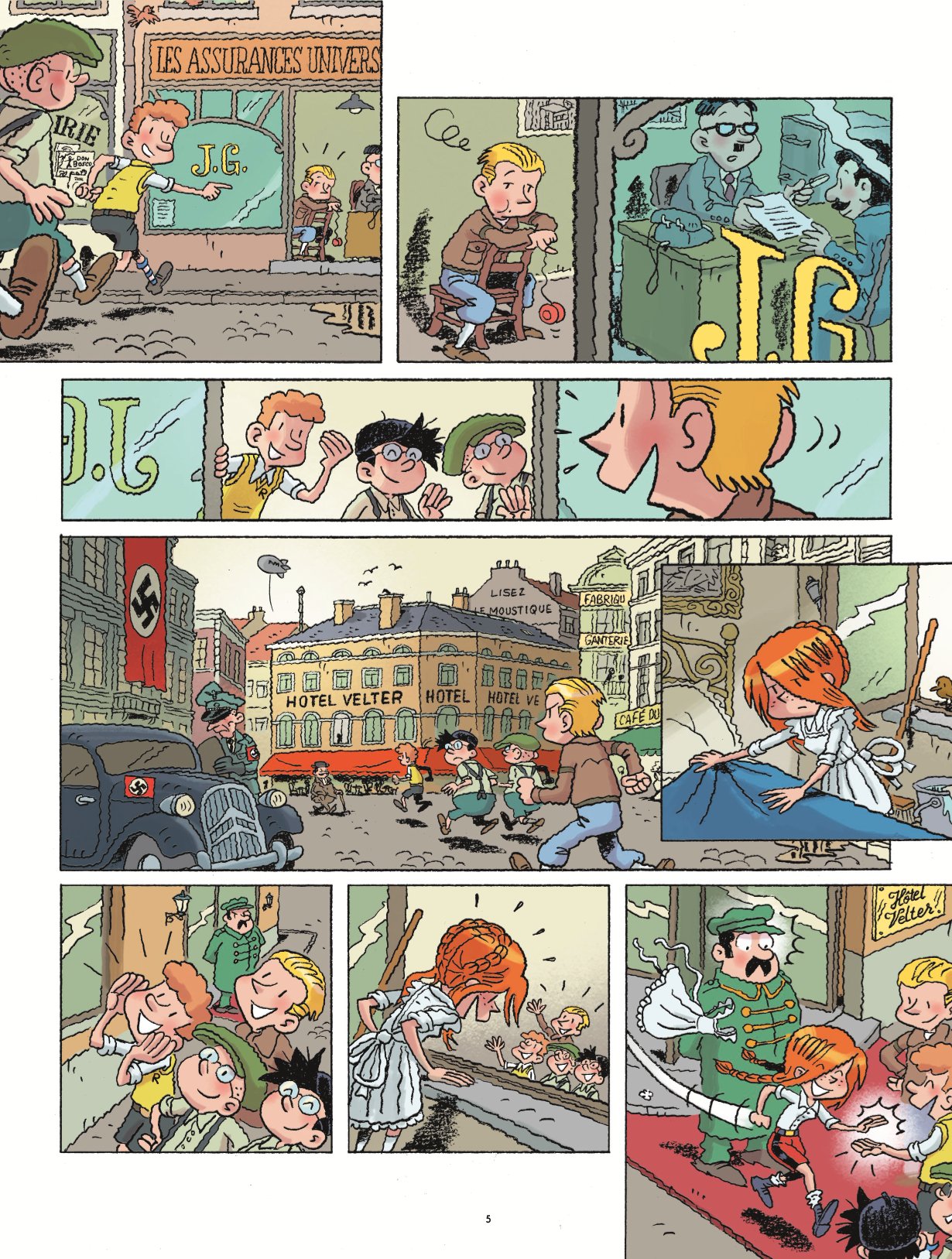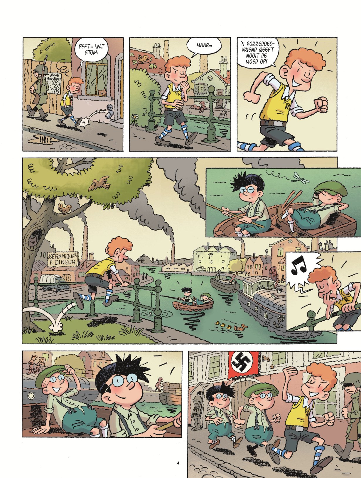 Gemiddelde score 5 / 5Robbedoes blijft mensen inspireren, dat merk je tegenwoordig aan de vele spin-offs die uit de grond rijzen. Maar zelfs in de Tweede Wereldoorlog was de favoriete stripheld al een voedingsbodem voor verzetstrijders… België, Marcinelle 1943, we volgen de tienjarige Flup die naar de kiosk treedt om zijn favoriete stripblad te gaan kopen. Hij druipt echter teleurgesteld af als hij te horen krijgt dat ‘Robbedoes’ door de Duitsers verboden is. Daarop besluit hij zijn Robbedoesvrienden op te trommelen en een plan te bedenken om de Duitsers een hak te zetten. Even later in 1944 staat Doisy, hoofdredacteur van het blad ‘Robbedoes’, stil bij het graf van 2 Robbedoesvrienden. Hij voelt zich schuldig voor hun dood, want ze werden geïnspireerd door de Erewet die wordt voorgesteld in het weekblad ‘Robbedoes’. Daarbij haalt hij samen met de priester herinneringen naar boven over de 6 Robbedoesvrienden en komen we beetje bij beetje het verhaal van de vrienden te weten. Dit is alles ten tijde van de onderdrukking door de Duitse vijand, waarbij alles in het geniep moest gebeuren als je als verzetstrijder wilt gelden.. Het Frans-Belgische auteursduo Jean-David Morvan (scenarist) en David Evrard (tekenaar) zijn voornamelijk bekend van Irena en de gelijkenissen zijn niet ver te zoeken. Ook hier leggen beiden, samen met inkleurder Benoit Bekaert, een dijk van een strip neer. Het verhaal is kinderlijk getekend in de typische stijl van Evrard, met de vloeiende lijnen (wat je heel letterlijk mag nemen). Maar dit past perfect in dit thema, wat het allemaal iets zachter maakt. Door het kleurgebruik komen de Robbedoesvrienden naar buiten als de vrolijke kwajongens, tegenover de grauw ingekleurde Duitsers. Het verhaal zelf blijft plakken en je wilt weten hoe het de vrienden zal vergaan. Dat het verhaal gebaseerd is op waargebeurde feiten, helpt eveneens. Het zit ook vol verwijzingen naar andere striphelden: Baard en Kale, Jan Kordaat, Quick en Flupke, Bollie en Billie, Blake en Mortimer,… zelfs Irena komt even opdraven. Het zit hem soms in de kleine details, wat het net zo leuk maakt. Achteraan het album word je als afsluiter getrakteerd op een extra dossier die terug grijpt naar de feiten waarop het verhaal gebaseerd is. Leuk dat dit een trilogie wordt, want dit eerste deel gooit alvast hoge ogen en doet verlangen naar meer ! Topper !