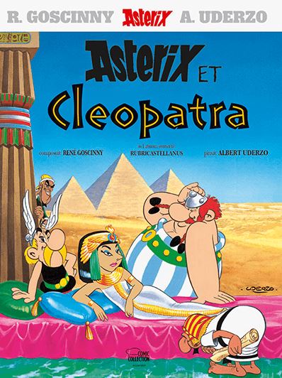 Latijnse versie Geërgerd door haar sarcasme wedt Cleopatra met Caesar om een ??weelderig paleis ter ere van haar te bouwen in de stad Alexandrië, in drie maanden tot op de dag van vandaag! Voor Numerobis, de architect aan wie de koningin het project toevertrouwde, is het een onmogelijke opdracht. Vooral omdat Amonbofis, zijn jaloerse rivaal, er alles aan zal doen om zijn project in gevaar te brengen. Hij heeft nog maar één hoop: Panoramix, de Gallische druïde met magische krachten.. Geen enkele omslag van de Asterix serie verwijst zo duidelijk naar een speelfilm en getuigt zo sterk van de geest die in de jaren zestig het weekblad Pilote kenmerkte. De ongebreidelde fantasie en de imaginaire vonk, die heel vanzelfsprekend van de scheppers van de striphelden overspringt op de lezers, komen op de omslag van deze schitterende strip duidelijk naar voren. De neus van Cleopatra is beroemd geworden dankzij Panoramix … en eindelijk komen we ook te weten waarom sfinxen geen neus hebben. In de vertalingen van de avonturen van Asterix stuit men vaak op verrassingen. Zo kent het in Frankrijk bekende dobbelspel «421» geen equivalent in Engels sprekende landen. Daarom is op de dobbelstenen als winnende combinatie de cijfers 6,6,6 te zien. Verderop in het album leest Plurkis in de Franse versie de krant «Pharaon-Soir» met de strips «Chéri-Bibi» en «Isis de mon Cœur». In de Nederlandse versie wordt dit de «Farao graaf» met de strips «Toengis» en «Isis en Adonis»!