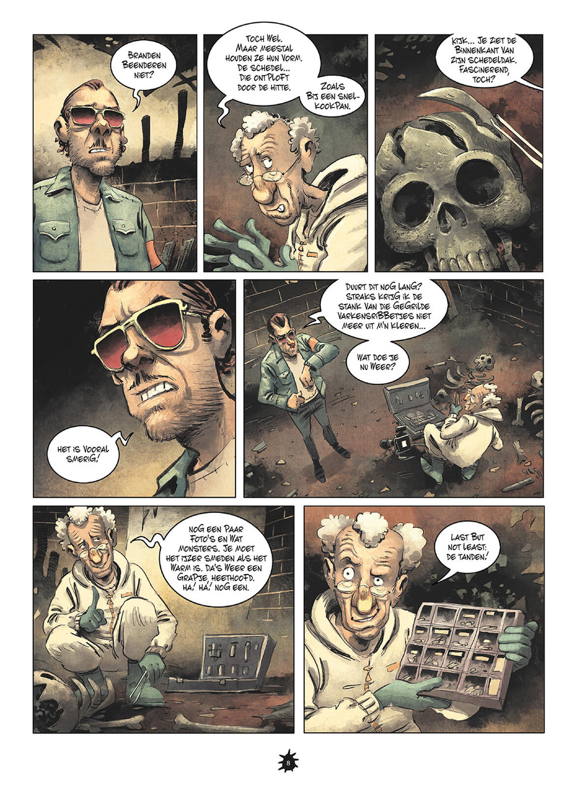 Uiteraard mogen ze niets voor zichzelf meenemen uit de huizen. Dat wordt streng gecontroleerd door de bazen van de firma RIP. Maar dan is er die dure ring... We bekijken elk album vanuit een ander perspectief. Ons 'bewijsbord' wordt even een kluwen. Scenarist Gaet's (The Beatles in stripvorm, Catamount) is een meester in montage. Hij laat ons genieten, want we sterven maar één keer!