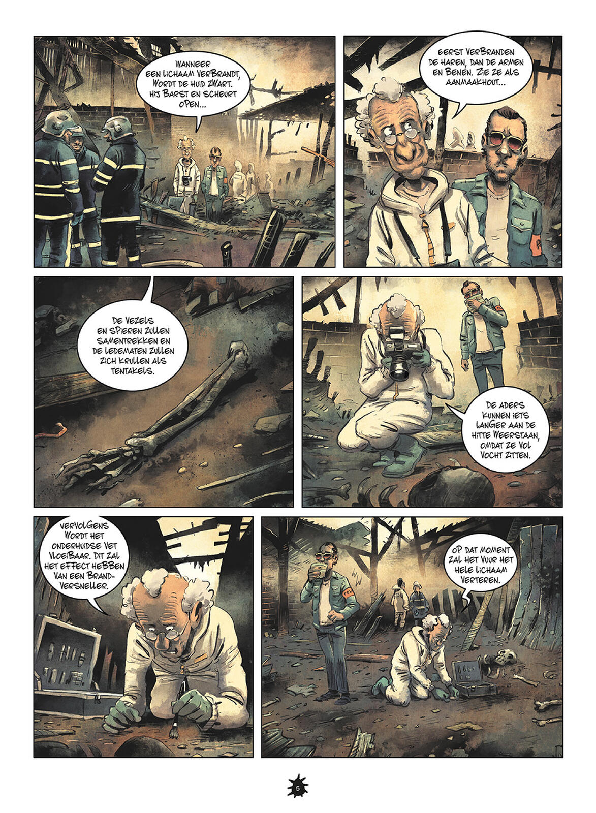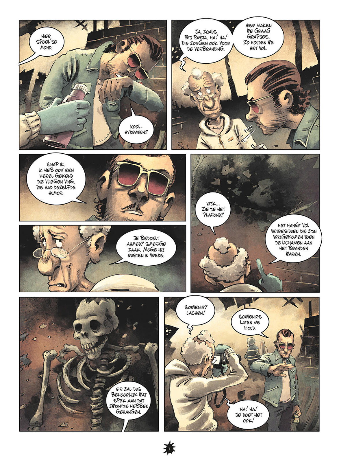 Hun werk is 'de dood'. Het leven is dan ook maar een vlammetje dat even opflakkert. Zes rare figuren halen huizen leeg waar de lijken al (te) lang liggen te rotten. De maden zijn er de baas. Derrick heeft een vreselijke hoest. Zijn rotte tanden zullen ongetwijfeld wel eens uitvallen door deze hoestbuien. Met zijn onbetrouwbare vriendin is hij niet echt opgezet. Maurice - in een vorig leven meneer Mercello Camperetti - zag zijn vrouw voor zijn neus neergeschoten worden. Hij doet dit smerige werk al dertig jaar en heeft kanker. Van zijn dochter blijf je beter af. Ahmed leren we kennen op zijn eerste werkdag. Hij heeft al leukere dingen gedaan, bijvoorbeeld met zijn vriendin Bouarfa Jihann.