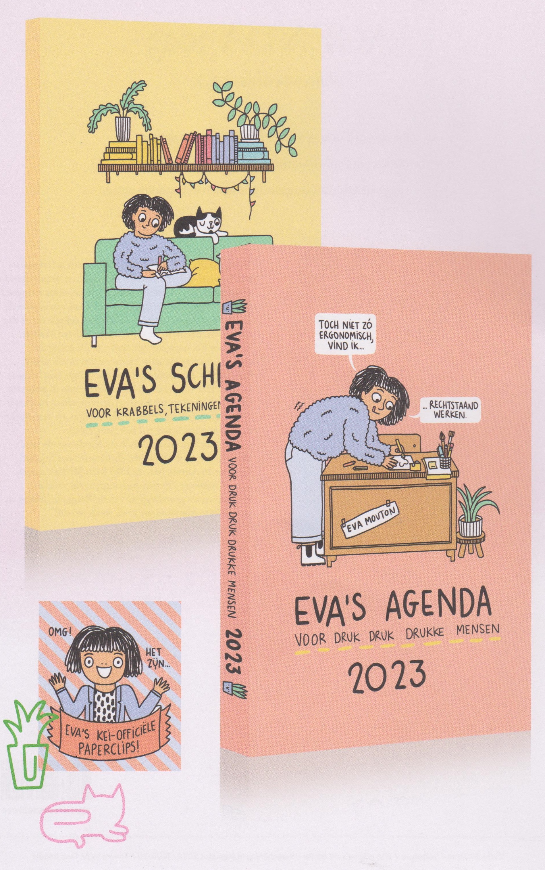 Na het grote succes van de vorige twee Eva’s Agenda’s kon een derde niet uitblijven. De populaire illustratrice Eva Mouton brengt een overzichtelijke agenda voor 2023, met invulpagina’s die je kan personaliseren, handige weekoverzichten en de grappigste niet-alledaagse feestdagen. Dit keer zit er een nieuw, leuk extraatje bij: vijf vrolijke paperclips, in haar gekende stijl. Ideaal om dat boodschappenlijstje, liefdes- of doktersbriefje snel bij de hand te hebben. Bovendien zit er in vijf exemplaren een gouden paperclip verborgen. De gelukkige vinders mogen zich aan een heel speciale prijs verwachten! Zoals steeds zit er ook een extra schriftje bij de agenda, voor wie nog extra wil krabbelen tijdens een meeting of geniale, nachtelijke ideeën wil neerschrijven.