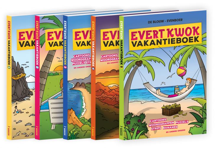 Met dit Evert Kwok Vakantieboekpakket heb je gegarandeerd een gortdroge vakantie! Evert Kwok Vakantieboek 1, 2, 3, 4 én 5 samen voor 45 euro! Elk Evert Kwok vakantieboek staat bomvol woordgrappen, cartoons, puzzels, kleurplaten, bananen en andere ongein ontsproten aan het brein van cartoonisten De Blouw en Evenboer. Al jaren maakt dit duo furore met überflauwe cartoons, maar ook met stripjes, fotograppen en oneliners. In dit boek gaat Evert helemaal los, onder het motto: als het maar gortdroog is. Want zeg nou zelf, wie wil er nou geen droge vakantie?