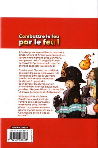 Afin d'apprendre à utiliser la puissance brute, Shinra et Arthur commencent un sévère entraînement avec Benimaru, le capitaine de la 7e brigade. Ils vont découvrir la "pression de la mort" et devront dépasser leurs limites !! D'autre part, Tamaki, qui a décidé de se joindre à eux après avoir pris conscience dans les souterrains qu'elle avait encore beaucoup de choses à apprendre pour devenir plus forte, suit un entraînement avec les deux soeurs jumelles Hikage et Hinata. La jeune fille va devoir surmonter ses faiblesses !! Mais les sbires du Grand Prédicateur vont sortir de l'ombre en se déclarant les messagers de la volonté divine. Le moment est venu pour le monde entier de s'unir. Comment la 8e va-t-elle se battre ? !