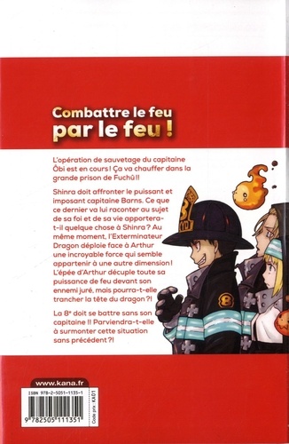 L'opération de sauvetage du capitaine Ôbi est en cours ! Ca va chauffer dans la grande prison de Fuchû !! Shinra doit affronter le puissant et imposant capitaine Barns. Ce que ce dernier va lui raconter au sujet de sa foi et de sa vie apportera-t-il quelque chose à Shinra ? Au même moment, l'Exterminateur Dragon déploie face à Arthur une incroyable force qui semble appartenir à une autre dimension ! L'épée d'Arthur décuple toute sa puissance de feu devant son ennemi juré, mais pourra-t-elle trancher la tête du dragon ? ! La 8e doit se battre sans son capitaine !! Parviendra-t-elle à surmonter cette situation sans précédent ? !
