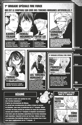 L'humanité est terrifiée par le phénomène de combustion humaine. Des brigades spéciales Fire Force ont donc été mises en place avec pour mission de trouver la cause de ce mystérieux phénomène ! Le jeune Shinra, nouvelle recrue surnommée le Démon, rêve de devenir un héros. Mais le chemin sera long et il devra, avec ses camarades, apprendre à affronter quotidiennement des Torches humaines !!