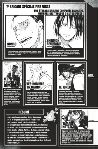 Le mystérieux Joker a fait une révélation fracassante à Shinra : son frère Shô est en vie et il est l'un des leaders de la secte du Grand Prédicateur. Comment Shinra et ses compagnons de la 8e brigade vont-ils réagir ? Le mystère de la formation de la 8e brigade va également s'éclaircir ! Et tout le monde va se mettre en route pour Asakusa afin de trouver des indices sur le Grand Prédicateur et affronter la 7e brigade ! Entre incendies et bagarra : ça va encore chauffer !!