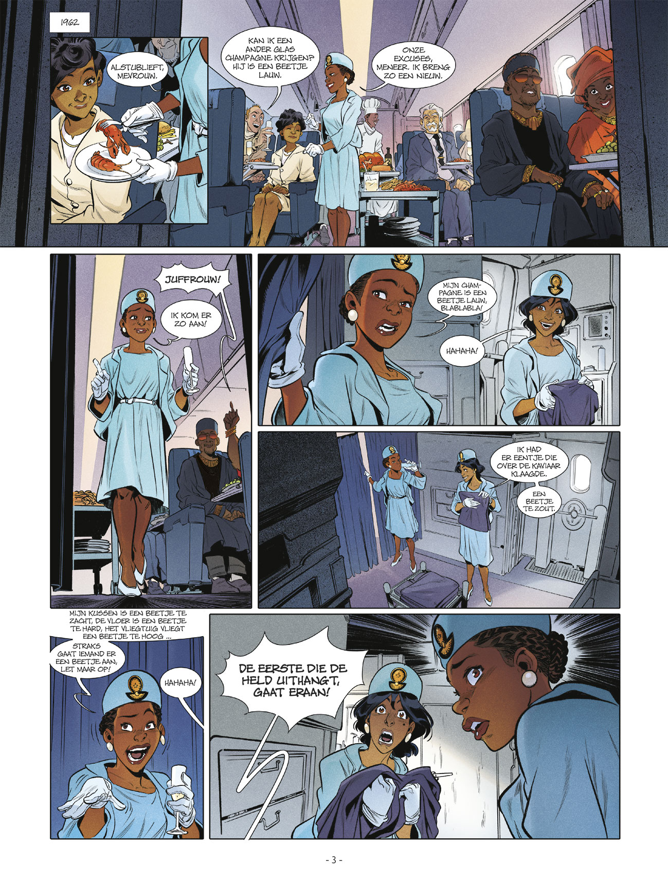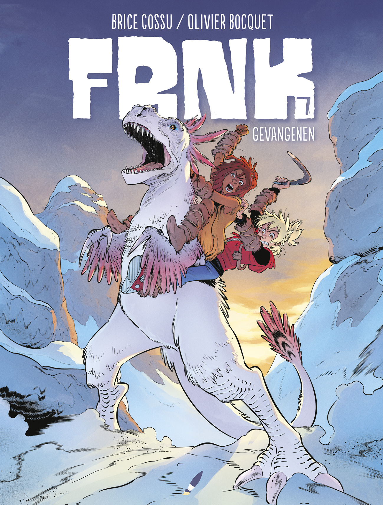 Gemiddelde score 4 / 5Dat Diedeldus een succesvolle spin-off van Daedalus is, gaat niemand ontkennen. Deze reeks is daarbij intussen een gevestigde waarde, en terecht. In dit verhaal volgen we een vliegtuig in het jaartal 1962 dat op weg is naar zonnige oorden, tot dit gekaapt wordt door een 3-tal gangsters. Als de stewards in opstand komen, wordt 1 van de piloten per ongeluk neergeschoten en dreigt het vliegtuig neer te storten. De andere piloot kan het vliegtuig terug in balans brengen, maar het vliegtuig is reeds uit koers. Wat later verdwijnt het door een portaal naar de prehistorie. Daar crasht het vliegtuig waarbij Krauss de leiding neemt over de groep mensen. 1 koppel neemt echter het initiatief in eigen handen en ontsnapt met hun dochter Kenza de wildernis in… Enkele jaren later komt Kenza als tiener in contact met Frank. Samen met Francisco besluiten ze het kamp van Krauss binnen te dringen via het ‘kippenhok’ vol dinosauriërs. En dan is het hek van de dam.. Dat ieder FRNK-album garant staat een doldwaas avontuur staat buiten kijf. Scenarioschrijver Olivier Bocquet (De toorn van Fantomas,…) weet telkens te verrassen met een leuk verhaal in een prehistorisch kader. Daarbij zorgt de combinatie van mensen uit onze tijd en de oermensen dikwijls voor hilarische gesprekken. Dit maakt het een mooi gebalanceerd verhaal met grappige passages. Vooral de humor in dit verhaal/deze reeks verdient een pluim. Dit wordt versterkt door de prachtige tekeningen van de hand van Brice Cossu (Carthago, De orde van de Drakenridders, …). Deze zitten vol detail en hij weet de humor heel goed over te brengen. Ook de sfeervolle inkleuring door Yoann Guillo dient een vermelding. Dit is bijgevolg opnieuw een topper geworden in deze reeks, een leuk tussendoortje voor zowel jong als oud!