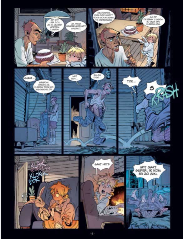 Na een uitbarsting zocht de hele stam zijn toevlucht in een boomstam, een geïmproviseerde boot, om aan de toorn van de vulkaan te ontsnappen. Aangezien Frnk de laatste is die Léonard en zijn vriend heeft gezien, beschuldigt iedereen hem ervan hen te hebben achtergelaten om te sterven ... En hij kan nauwelijks verklaren dat ze naar de 21ste eeuw werden verscheept via het meer waarmee hij zelf in de prehistorie terechtkwam! Frnk heeft geen tijd om bij te komen van al deze onthullingen dat hij gevangen is genomen door een stam van kannibalen onder leiding van een wrede baas wiens dochter een oude bekende van Frnk is ... Geen telefoon, geen internet, geen klinkers: een 13-jarige weesjongen gaat op zoek naar zijn ouders en belandt in de oertijd. Frisse jeugdreeks vol humor en avontuur. Wervelend scenario van creatieve duivel-doetal Olivier Bocquet (De toorn van Fantomas) die stripscenario's afwisselt met televisiewerk en romans.