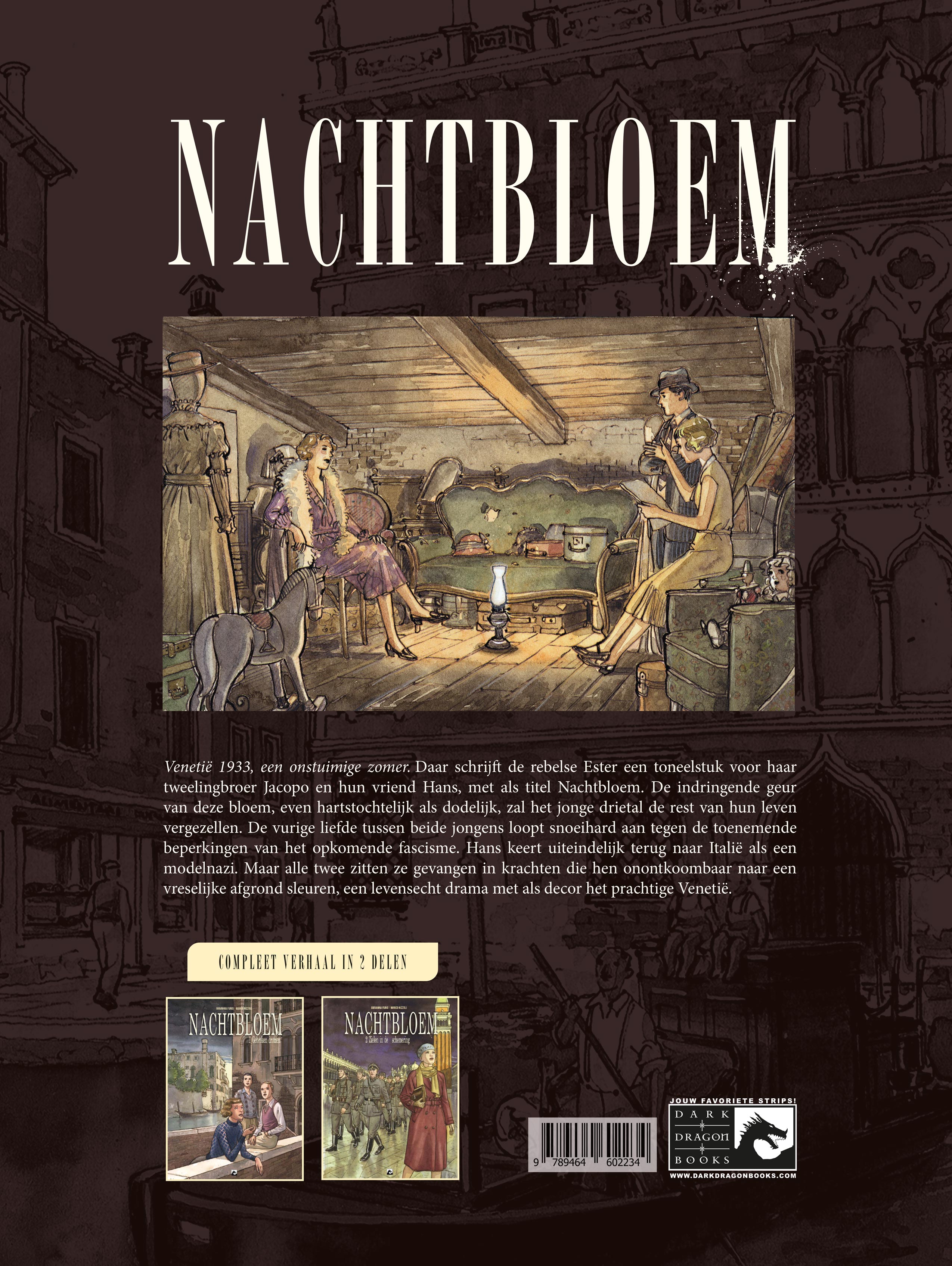Aanrader! Een verboden liefdesverhaal in het hart van het fascistische Italië. Zomer 1933, Venetië. Een meisje en twee jongens. Hans en Jacopo behoren beiden tot de elite, maar hun liefde wordt tegengewerkt door de politieke kampen waartoe hun families behoren. Jacobo is joods. Hans een vertegenwoordiger van het nazisme in Italië. Hoe kan hun relatie de culturele, sociale en politieke veranderingen van die tijd overleven? Een duister, elegant tweeluik, Nachtbloem gaat over een van de donkerste periodes in de geschiedenis door de roze bril van verboden liefde. Een menselijke tragedie over de tegengestelde kanten van de ziel: verraad & trouw, vreemdelingenhaat & idealisme, zuiverheid & gemeenheid, jaloezie & zelfverloochening...