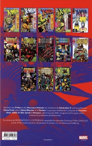 Quand les terribles Phalanx s'attaquent à la Terre, ils s'en prennent d'abord à la nouvelle génération de mutants. Après le conflit, Charles Xavier confie à Emma Frost et au Hurleur, le soin de recueillir et d'entraîner ces jeunes mutants rebelles et torturés. Jubilé, M, Husk, Skin, Synch vous attendent pour une nouvelle ère d'aventures mutantes ! Scott Lobdell est un des principaux architectes de la franchise X-Men au cours des années 90. L'une de ses grandes réussites est la création de Génération X, une équipe moderne et dynamique, portée également par les dessins de Chris Bachalo (Wolverine and the X-Men). L'arrivée de la série en INTEGRALE était très demandée, voici le voeu des fans enfin exaucé !