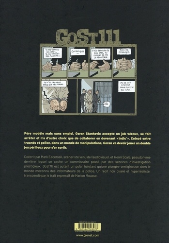 Une plongée vertigineuse dans le monde des informateurs de la police. Père modèle mais sans emploi, Goran Stankovic accepte un job véreux, se fait arrêter et n'a d'autre choix que de collaborer en devenant "indic'" . Coincé entre truands et police, dans un monde de manipulations, Goran va devoir jouer un double jeu périlleux pour s'en sortir. Coécrit par Mark Eacersall, scénariste venu de l'audiovisuel, et Henri Scala, pseudonyme derrière lequel se cache un commissaire passé par des services d'investigation prestigieux, GoSt111 est autant un polar haletant qu'une plongée vertigineuse dans le monde méconnu des informateurs de la police. Un récit noir ciselé et hyperréaliste, transcendé par le trait expressif de Marion Mousse.
