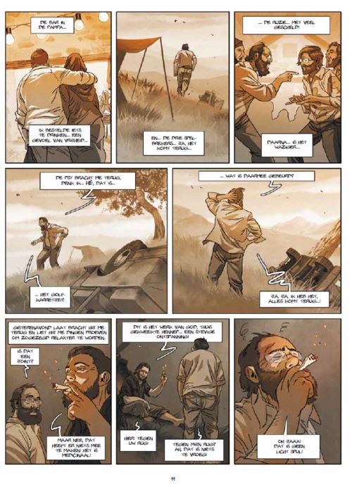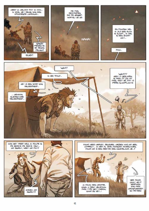 Gemiddelde score 3 / 5Jim publiceerde al jaren strips vooraleer hij zijn echte doorbraak kende met “Een nacht in Rome”. Daarin speelt een veertigjarige man de hoofdrol, en dat lijkt me overeen te komen met de gemiddelde hedendaagse lezer. Raphaël deed dan nog waar iedere gesettelde burger ook wel eens aan denkt maar niet durft te doen: afspreken met een vroegere geliefde. Ook in de volgende tweeluiken was de situatie herkenbaar zo staat er een ruzie centraal in “de erectie”. In “Helena” ging het over het knappe meisje van de klas waar je nooit mee durfde te praten. In dit tweeluik gaat het deze keer meer over onthaasten, hoe gaan we om met de werkdruk, het constant bereikbaar zijn en moeten presteren. Ook deze keer staat een veertiger centraal. Mathias D’Ogrement is een echter carrièreman. Zijn werk komt op de eerste plaats, daarna volgt zijn status en als laatste zijn gezin. Als geslaagde zakenman houdt hij meer van cijfers en zijn secretaresse dan van zijn vrouw en kinderen. Het liefste laat hij zijn jaarlijkse vakantie dan ook aan zich voorbij gaan om nog te helpen bij een grote zakendeal. De bedrijfsarts maant hem echter aan tot meer kalmte omdat zijn bloeddruk wel erg hoog is. Dan slaat het noodlot toe. Niet Mathias, maar wel zijn geliefde secretaresse sterft aan een beroerte. Op de dag van de begrafenis slaan de stoppen bij Mathias door, terwijl zijn gezin op hem wacht om op reis te vertrekken vlucht hij weg en schrijft zich in voor een detoxstage. Daar wachten hem 10 dagen van onthouding in de natuur, zonder telefoon, zonder internet en met als enig voedsel rozemarijnsap. Iedere deelnemer krijgt een tent en mag zich in stilte wijden aan de onthaasting. Te midden van al het new age-geitenwollensokken-chakra gedoe voelt Mathias al vlug de rebel in zich opkomen, maar zowel de organisatie, de natuur als zijn eigen rug werken niet mee. In het afsluitende deel van dit tweeluik komt Mathias echter al vlug tot inkeer. Zodat de toon van het verhaal wat omslaat. Het verhaal wordt minder humoristisch en gaat wat meer zweven. Jim danst met dit tweede deel dan ook op een slap koord. In dit tweede deel vliegen de wijsheden je om de oren. De krachtige personages en de epiloog waarin Jim alles wat weet te relativeren zorgen er echter voor dat we niet met een kleffe smaak in de mond achterblijven. Jim kreeg het idee voor dit verhaal nadat een van zijn vrienden zo’n detoxstage had gevolgd. Het personage van Mathias is dan ook op hem gebaseerd. Voor dit tweeluik werkte Jim samen met Antonin Gallo, die vooral gekend is als illustrator. Jim tekende de personages en Gallo tekende de decors. Alles is uitgevoerd in sepiatinten. Wat direct een warm gevoel oproept. Jim gebruikt zo weinig mogelijk tekst, dit zorgt soms voor prachtige tekstloze pagina’s waar je zeker de tijd voor moet nemen. Ze zorgen ook voor rust zodat je de verkondigde wijsheden wat kan laten bezinken. Ook dit keer weet Jim ons te beroeren. Hij slaagt er in om ons toch sympathie te doen krijgen voor Mathias alhoewel hij eigenlijk alleen maar met zichzelf bezig is. Hij weet ook handig te vermijden dat zijn verhaal een te hoog “geitenwollen sokken” gehalte krijgt door nu en dan een komische noot in te voegen en die alles toch wat relativeert. Daarenboven tillen de tekeningen het verhaal naar een hoger niveau zodat dit zonder twijfel een topstrip is die zijn plaats verdient in menig eindejaarslijstje!"