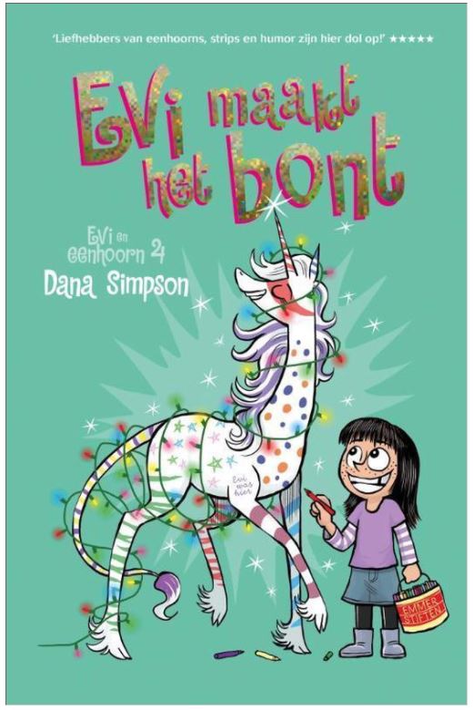 Evi en eenhoorn is het eerste deel in de hilarische graphicnovelserie van Dana Simpson. Volledig in kleur, voor meisjes vanaf 8 jaar. Evi en eenhoorn shinen als nooit tevoren. Zelfs als ze geconfronteerd worden met nare glittergriep en kamers die zichzelf niet opruimen. Deze serie is smullen voor heel veel leeftijden. Evi maakt het bont is deel 4 in de populaire serie Evi en eenhoorn van Dana Simpson. Lachen verzekerd voor eenhoornfans vanaf 8 jaar en hun ouders. Evi en eenhoorn shinen als nooit tevoren. Zelfs als ze geconfronteerd worden met nare glittergriep en kamers die zichzelf niet opruimen. Basisschoolproblemen en de worsteling om jezelf te zijn, vermengd met narcisme (eenhoorn), sarcasme (Evi) en een vleugje magie. Deze serie is smullen voor heel veel leeftijden.