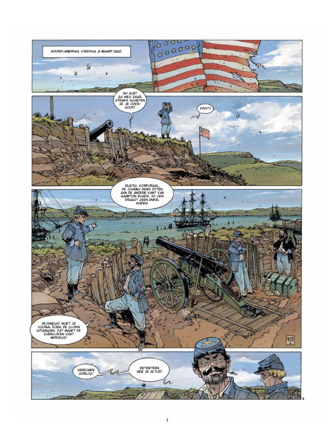 In volle Amerikaanse Burgeroorlog bouwen de Zuidelijken de USS Merrimack, een achtergelaten schip van de Noordelijken, om tot een van de eerste pantserschepen van de geschiedenis: de CSS Virginia. Maar ook hun tegenstanders blijven niet bij de pakken zitten en stomen een nog revolutionairder schip klaar: de USS Monitor. Tijdens de slag van Hampton Roads treffen de twee oorlogsschepen elkaar. De strijd blijft onbeslecht. Toch vormt de slag een keerpunt voor de oorlogsvoering op zee. Slag tijdens de Amerikaanse Burgeroorlog tussen de eerste twee pantserschepen uit de geschiedenis. Historisch accurate avonturenreeks rond de grootste zeeslagen uit de wereldgeschiedenis. Een collectie geregisseerd door Jean-Yves Delitte (Black Crow, Het bloed van lafaards).