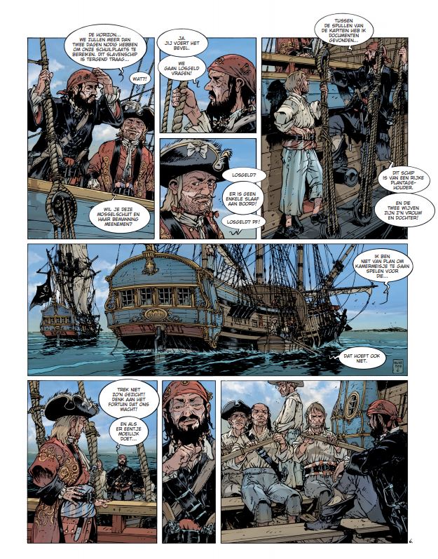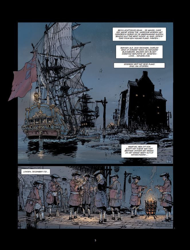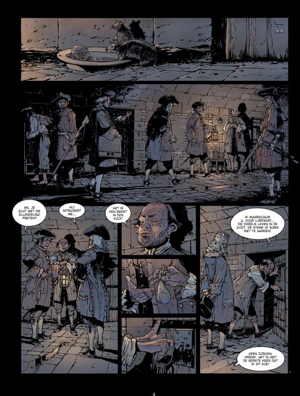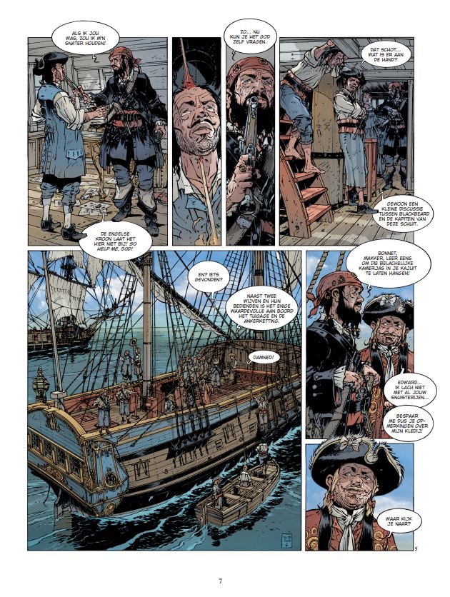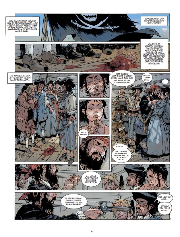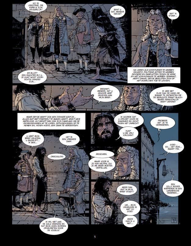 Jean-Yves Delitte (België, 1963) kennen we ook van volgende stripreeksen of delen hieruit waaraan hij meewerkte: • Achter de schermen van de macht • belem • Black Crow • Black Crow vertelt • De Grote Zeeslagen • De Neptunus • De Nieuwe Tsaren • > Het Bloed van de lafaards • Tanatos • U-boot In de eerste decennia van de achttiende eeuw trekt schrijver Daniel Defoe van gevangenis naar gevangenis om te praten met piraten. Ze zijn voor hem een onuitputtelijke bron van informatie. De Engelse schrijver maakt ook gebruik van zijn bekendheid en zijn relaties om vergissingen aan de kaak te stellen in een tijd waarin het gerecht al te vaak voortvarend optreedt en onschuldigen terechtstelt. Dat lijkt ook het geval te zijn in december 1721, in de vochtige Londense kerkers van Marshalsea. Een man schreeuwt zijn onschuld uit, al geeft hij wel toe dat hij de beruchte Edward Teach, bijgenaamd Blackbeard, heeft gekend. Maar hun relatie was anders dan wat wordt beweerd. Hij was het slachtoffer en niet de handlanger van een van de verschrikkelijkste piraten uit de geschiedenis. Maar vertelt hij wel de waarheid? Jean-Yves Delitte brengt met dit eerste deel van Blackbeard een fantastisch geïllustreerd verhaal. In dit tweeluik waar geschiedenis en mythe in elkaar overvloeien, schildert hij met veel respect en passie voor de barse zee een schitterend zeevaartepos.