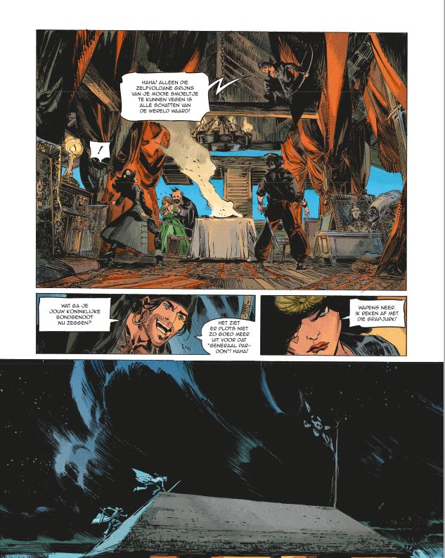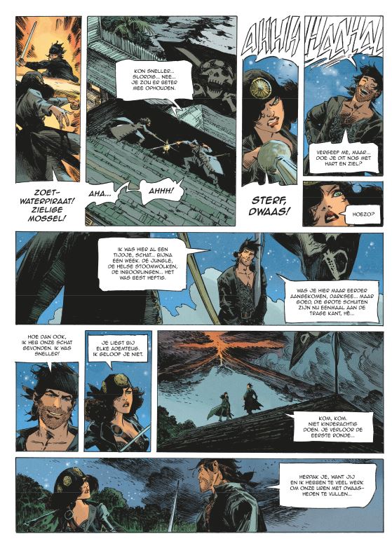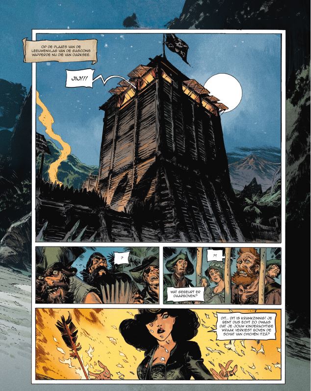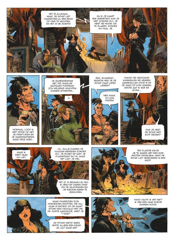 Gemiddelde score 4 / 5Mathieu Lauffray maakte naam met het vierdelige piratenepos “Long John Silver”. Samen met Xavier Dorison maakten ze hun versie van Stevensons Schatteneiland. Toen stonden ze zowat aan de wieg van de revival van piratenstrips. Lauffray houdt blijkbaar erg van piratenverhalen, maar dit keer doet hij het helemaal alleen en verzorgt hij ook het scenario. Het verhaal van Raven is losjes gebaseerd op de novelle “Black Vulmea’s vengeance” van Robert E Howard. Raven is een eigenzinnige piraat die zijn eigen gang gaat. Hoewel hij sterk en dapper is heeft hij ook een sterke eigen wil en laat hij zijn eigenbelang primeren op dat van de groep. Dit maakt hem niet populair op Tortuga, het pirateneiland. Als door zijn toedoen het schip en de ganse bemanning van kapitein Black Vane naar de dieperik verdwijnt helpt dat hem daar ook niet bij. Hij wordt helemaal persona nog grata op het pirateneiland als hij ook Lady Darksee tegen zich in het harnas jaagt. Darksee krijgt van de gouverneur de opdracht om de mythische schat van Chichen Itza te zoeken op Devil’s mound in ruil voor de helft van de schat en een generaal pardon. Raven bespioneert hen maar wordt betrapt en gaat alleen op zoek naar de schat. Devil’s Mound is echter een onherbergzaam eiland, het wordt beheerst door een actieve vulkaan en er leeft nog een wilde stam van koppensnellers. Er is ook een Frans fort gevestigd dat daar door schipbreukelingen is gemaakt. In zijn energieke, krasserige stijl schotelt Lauffray ons een rechttoe rechtaan piratenverhaal voor. De kracht van dit verhaal zit hem niet in een ingewikkelde plot vol verrassende wendingen. Lauffray kiest voluit voor de actie. Het eiland zorgt voor spectaculaire decors zoals de mistige jungle, de uitbarstende vulkaan en de zure rivier. Ze geven Lauffray de kans om je via grote prenten dieper in het verhaal te sleuren. De wisselwerking tussen de twee protagonisten zorgt daarenboven voor het nodige vuurwerk, hun onderling wantrouwen leidt niet alleen tot stevige duels, maar ook tot pittige dialogen. Kortom een leuke rechttoe rechtaan strip waarbij je kan genieten van de prachtige tekeningen zonder dat je bang moet zijn dat je de draad van het verhaal zal verliezen! Hopelijk weet Lauffray ons in het volgende (afsluitende?) deel nog meer te verrassen en leren we ook wat meer kennen over het verleden van Lady Darksee, want dat is toch een personage waar we meer over te weten willen komen!