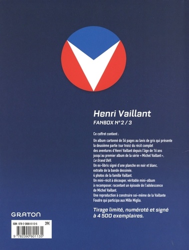 Ce coffret contient : Un album cartonné de 56 pages au lavis de gris qui présente la deuxième partie (sur trois) du récit complet des aventures d'Henri Vaillant depuis l'âge de 16 ans jusqu'au premier album de la série "Michel Vaillant", Le Grand Défi ; Un ex-libris signé d'une planche en noir et blanc, extraite de la bande dessinée ; 4 photos de la famille Vaillant ; Un mini-récit à découper, véritable mini-album à recomposer, racontant un épisode de l'adolescence de Michel Vaillant ; Une reproduction à construire soi-même de la Vaillante Foudre qui participa aux Mille Miglia.