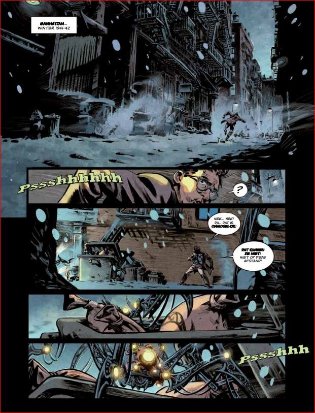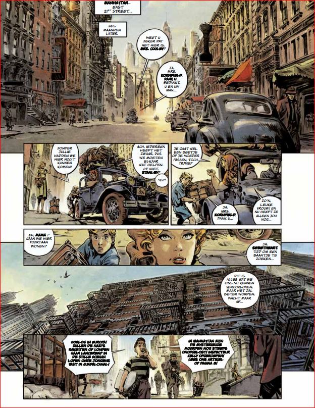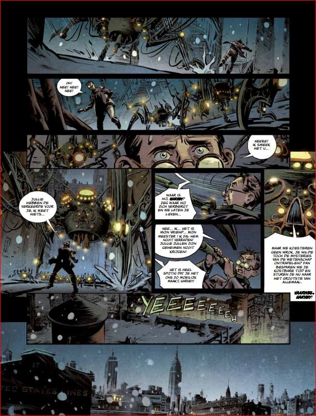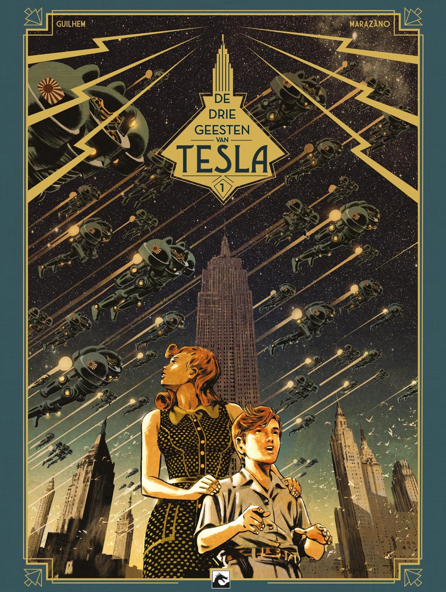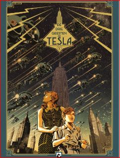 Gemiddelde score 5 / 5Als we de naam ‘Tesla’ tegenwoordig horen, denken we meteen aan de doorbraak van de elektrische wagen onder invloed van Elon Musk. Echter is dit een ode aan Nikola Tesla, naast Thomas Edison 1 van de grootste uitvinders in de 20ste eeuw. Laat deze reeks nu net daarop mooi inspelen. Het verhaal speelt zich af in het New York tijdens de 2de wereldoorlog (begin jaren 1940). Daarbij volgen we Travis en zijn moeder die, net zoals vele Europeanen, uitwijken naar veiliger oorden. Ze komen daar terecht op een appartement op de 13de verdieping, waar Travis in contact komt met zijn grimmige buurman. Al snel blijkt dat deze oude man weinig vriendelijke indrukken nalaat, want de straatjongens uit de buurt beschouwen hem als boeman. Als Travis zijn moeder op een avond gaat werken, hoort Travis de buurman vertrekken. Travis besluit hem te volgen, waarbij de oude man naar de Brooklyn Bridge lijkt te gaan. Als Travis hem plots uit het oog verloren is, ziet hij uit het water vreemde duikers uit het water opduiken. Deze zetten meteen de achtervolging in op Travis… als Travis zich weet te verstoppen, ziet hij nog meer vreemde spinachtige wezens langs komen. Wat speelt er zich allemaal af in New York die op de rand van oorlog staat ? En wie is die vreemde man die alle contact mijdt ? Scenarist Richard Marazano (De expeditie, Genetiks, Minik,…) weet te imponeren met het verhaal. Alles lijkt wel aanwezig in dit verhaal: mysterie, spanning, vriendschap, fantasie, ontluikende liefde, wetenschap,… maar alles in mooie proportie en goed opgebouwd. Het stripverhaal heeft geen paginanummers maar je gaat zo vlot door het verhaal dat dit ook niet nodig is. De tekeningen getekend door Guilhem hebben hier zeker ook hun aandeel in. Let maar eens op de knappe interieurs en de mooi versierde trappen die hij weet te tekenen, ook de mechanische wezens zijn knap vormgegeven. Leuke kanttekening, de scenarist doet ook de inkleuring in deze strip. Dit bewijst ook hoe goed beide auteurs op elkaar afgestemd zijn. Dit is het eerste deel van een drieluik en doet meteen verlangen naar meer. Neem de sfeer van ‘De 4 van Baker Street’, gooi er wat wetenschappelijke achtergrond bij en giet er een sausje van mysterie over en je hebt een recept om van te smullen.
