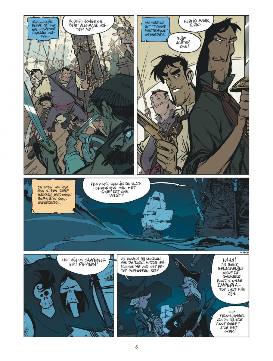 Campbell rouwt nog steeds om de dood van de Turk, de man die hem als kind alle kneepjes van het piratenvak heeft geleerd. De Turk heeft hen, Campbell en zijn broer - en later ook Fanny - onder zijn hoede genomen. Ze waren als kinderen op de dool en de piraat fascineerde hen met zijn kennis en kunde. Samen hebben ze alle zeeën doorkruist tot ze uiteindelijk terechtkwamen op het geheimzinnige eiland Sint-Brandamo, een eldorado met zoveel rijkdom dat de monniken die er voor anker waren gegaan meteen hun geloof afzwoeren en een van de machtigste dynastieën van Europa vormden. Twintig jaar later is de tijd rijp om de clan van de Turk weer bijeen te roepen en koers te zetten naar het schatteneiland. En liefst voor ze worden tegengehouden door een paar andere machtige families ... Jose Luis Munuera neemt de lezer mee op een dolle reis van de sympathiekste familie uit piratenland. En dat levert spannend, exotisch en humoristisch avontuur op.