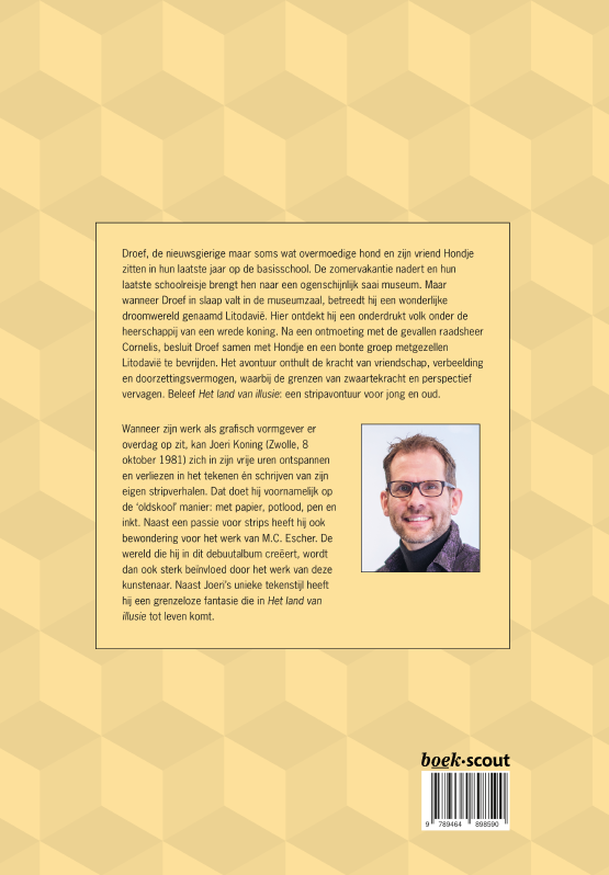Wanneer zijn werk als grafisch vormgever er overdag op zit, kan Joeri Koning (Zwolle, 8 oktober 1981) zich in zijn vrije uren ontspannen en verliezen in het tekenen én schrijven van zijn eigen stripverhalen. Dat doet hij voornamelijk op de ‘oldskool’ manier: met papier, potlood, pen en inkt. Naast een passie voor strips heeft hij ook bewondering voor het werk van M.C. Escher. De wereld die hij in dit debuutalbum creëert, wordt dan ook sterk beïnvloed door het werk van deze kunstenaar. Naast Joeri’s unieke tekenstijl heeft hij een grenzeloze fantasie die in Het land van illusie tot leven komt.
