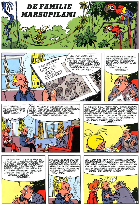 Ijzerlijm houdt een persconferentie om te melden dat ze een familie marsupilami's gevonden heeft in het Palombiaanse woud. Robbedoes ziet er misschien nog steeds uit als de keurige piccolo in rood uniform die hij ooit was, maar zijn leven is nu wel heel wat avontuurlijker dan dat van een hotelhulpje. Samen met zijn onafscheidelijke vriend Kwabbernoot en Spip, de grappige eekhoorn, vecht Robbedoes overal ter wereld tegen misdadigers. En zijn tegenstanders zijn niet min: zo moet hij het opnemen tegen de verschrikkelijke geleerde Zorglub of de boosaardige piraat John Helena, tegen de Italiaanse maffia en Chinese gangsterbendes in New York of gaat hij in Palombië het geheim van een raadselachtig dier ontsluieren: de Marsupilami.