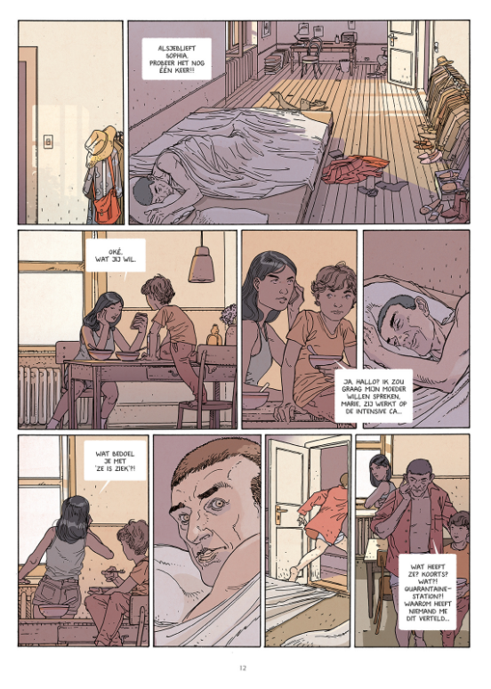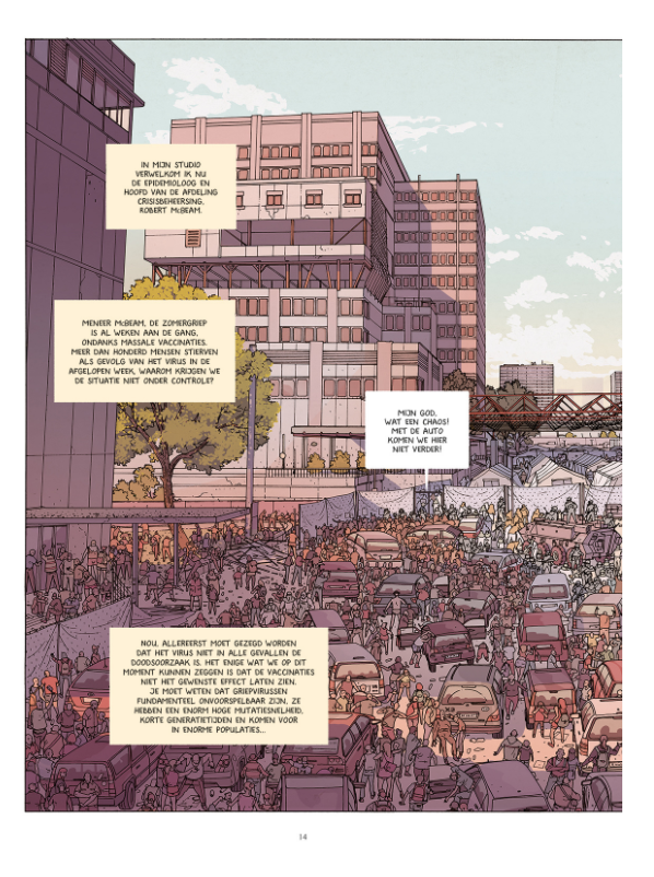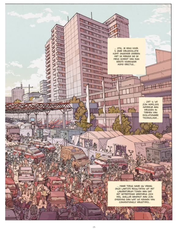 Gemiddelde score 5 / 5Wat als we het corona virus niet de baas kunnen? Dit zou wel eens de ondertitel kunnen geweest zijn van deze Dystopie. Jurad Muralt is een Zwisterse Tekenaar die ook nog voor de The New York Times werkt en hiermee zijn tweede stripverhaal aflevert. Het eerste was Hellship die verscheen bij Gorilla in 2015. We volgen een vader met zijn twee kinderen na het sterven van de moeder aan het zeer bedreigende virus. Het is een bijzonder verhaal geschreven enkele jaren geleden ( ja ja) dus voor de Covid 19 pandemie, dus ja een heel klein beetje helderziende is hij wel. De tekeningen zijn bijzonder realistisch en tot in de details uitgewerkt ( zie maar de dubbele pagina 15-16). Ook de kleuren maken de ideale sfeer die er heerst bij dergelijke scenario’s reëel. De off-line stem is perfect om in de sfeer te komen van het verhaal, het trekt je onmiddellijk mee in het verhaal en zorgt voor een duidelijk kader. De personages zijn uit de maatschappij getrokken, geen superhelden, geen emotionele toestanden maar realistische gedragingen van gewone mensen die zich in een uitzonderlijke situatie bevinden. De uitzichtloze situatie van de vader en de sterke karakters van zijn kinderen en vooral hoe deze drie omgaan met de tegenslagen en de harde wereld rondom hen zijn hier aangrijpend. Dit maakt het aantrekkelijk omdat het verhaal hierdoor nog aan densiteit wint en je als lezer nog meer raakt. Het scenario is heel plausibel niet uit de lucht gegrepen en zeker nu in deze tijden dat iedereen hier ook mee te maken heeft. Je herkent vele gelijkenissen met de huidige corona pandemie en dit maakt het extra interessant. Jurad gaat natuurlijk een héél stuk verder en mengt ook ecologische en economische elementen in het verhaal en zorgt voor een meer dramatischer klimaat. Maar het klimaat toont aan hoe het wel eens kon verlopen indien we het corona virus niet onder controle hadden kunnen krijgen. Een intrigerend eerste deel ( van 6) waarin we héél nieuwsgierig worden hoe vader Liam en Sophia en Max het er zullen van af brengen in deze bijzonder dreigende wereld vol gevaar. Bij het afsluiten van het eerste deel kunnen we alleen maar met verlangen uitkijken naar de volgende delen en even stilstaan hoe wij momenteel omgaan met het Covid 19 virus.