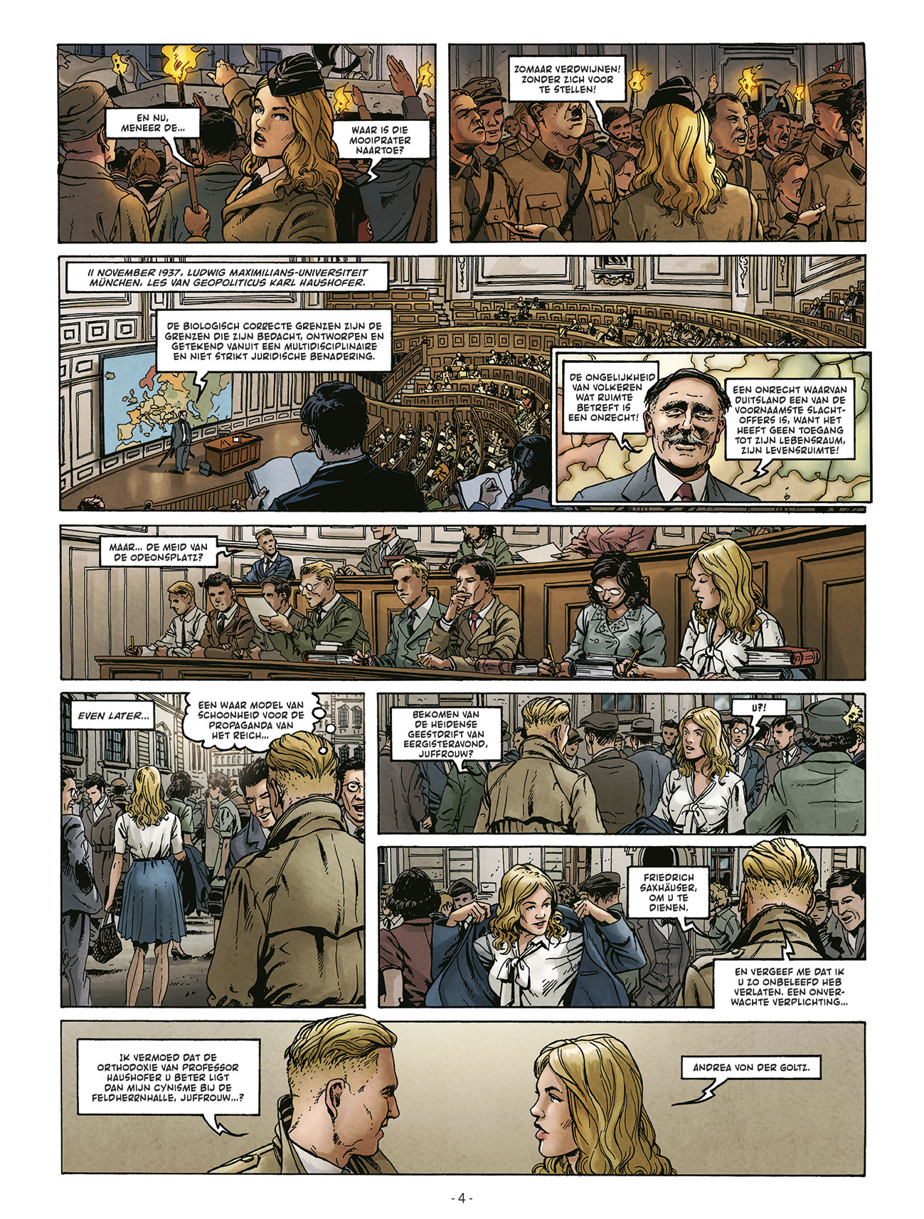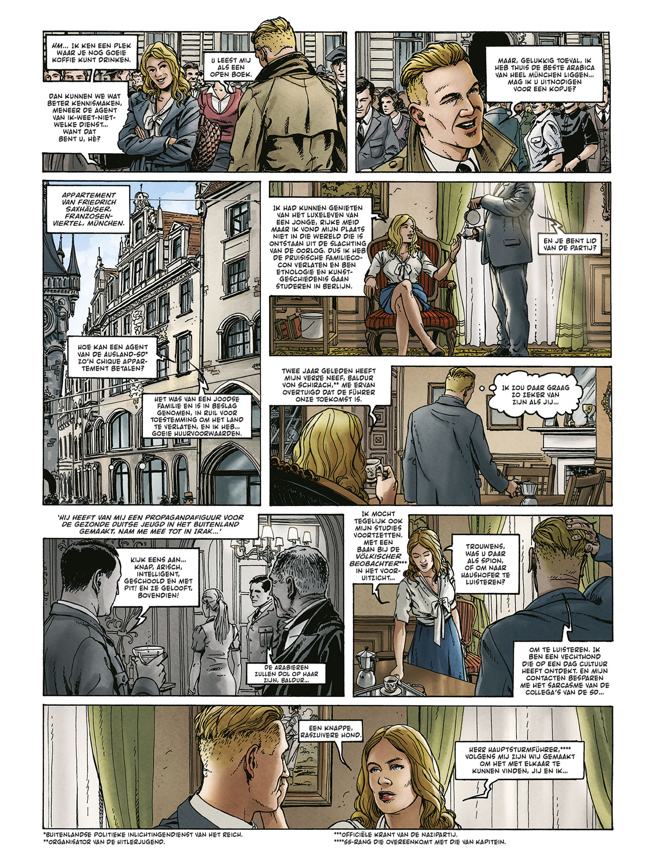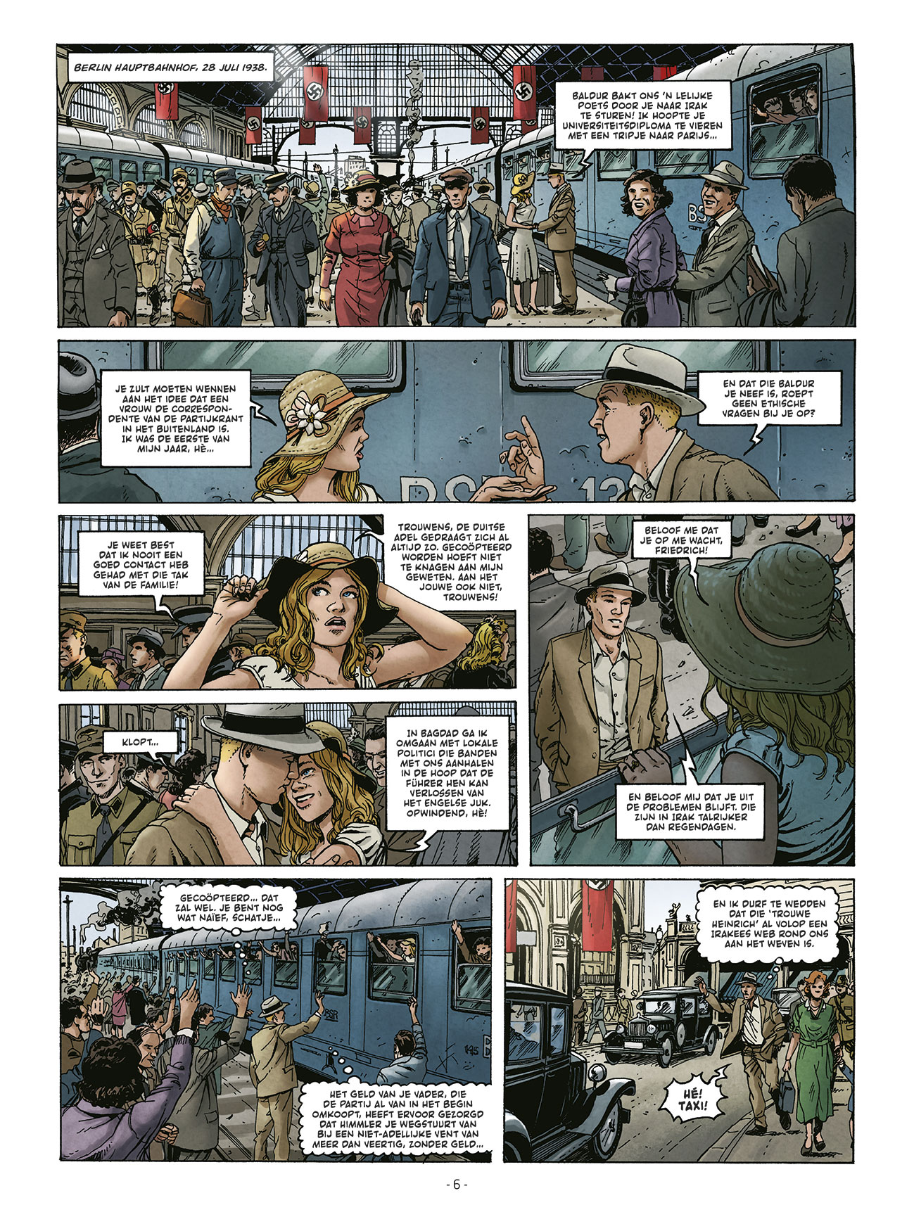 Gemiddelde score 3 / 5Het kasteel van miljoenen jaren is een verwijzing naar de tempel van Ramses III in Egypte. Meteen een goede bodem om een mysterieus verhaal op verder te bouwen, of niet ? Duitsland, in de vooravond van het begin van de Tweede Wereldoorlog. Duits officier Friedrich Saxhäuser wordt opgeroepen voor een speciale missie in Irak. Hij moet daar de Engelse invloed ondermijnen en proberen om het Midden-Oosten te overtuigen zich aan te sluiten bij het Arische rijk. Onder het mom van een archeologische expeditie doorkruist hij de vallei van de Tigris en de Eufraat. Rustige nachten heeft hij echter niet, want sinds een expeditie een paar jaar terug bij de Maya’s heeft hij constant het gevoel achtervolgd te worden. Als ze in Irak overnachten bij een tussenstop, wordt de plaats getroffen door een Bijbels onweer waarbij tussen de wolken zich een vreemd licht ontwaart. Als de lichtcirkel plotseling een straal afschiet naar beneden, wordt Friedrich hierdoor getroffen. Dit is nog maar het begin van een mysterieus avontuur… wat zullen ze vinden in de vallei ? Door wat is Friedrich getroffen en wie achtervolgt hem ? Scenarist Richard D. Nolane (gekend van Wünderwaffen, Space Reich, Warbirds,…) giet hierbij het werk van Stéphane Przybylski in een 4-delig stripformaat. Er wordt aangegeven dat het een mix wordt tussen Indiana Jones en de X-files. Die laatste komt er inderdaad in terug, de sfeer van Indiana Jones is echter ver te zoeken. Wat er eerder uitspringt (in minder positieve zin) zijn de vele titels ‘Führer’ die de Duitsers aanhielden destijds en de véle tijdsaanduidingen. Het verhaal heeft nochtans de ingrediënten om er een topper van te maken: nazi’s, Oosterse invloeden, buitenaardse mysteries,… Het komt echter allemaal heel traag op gang met soms onduidelijkheden in het verhaal en bitter weinig actie. De tekeningen door Zeljko Vladetic zijn vrij klassiek opgebouwd en weten weinig extra toe te voegen. De tekeningen zouden meer tot hun recht komen als deze meer bladvullend waren en niet gepropt waren in kleine kaders. Het verhaal weet momenteel weinig te verrassen, hopelijk brengt het vervolg meer boeiende plotwendingen.