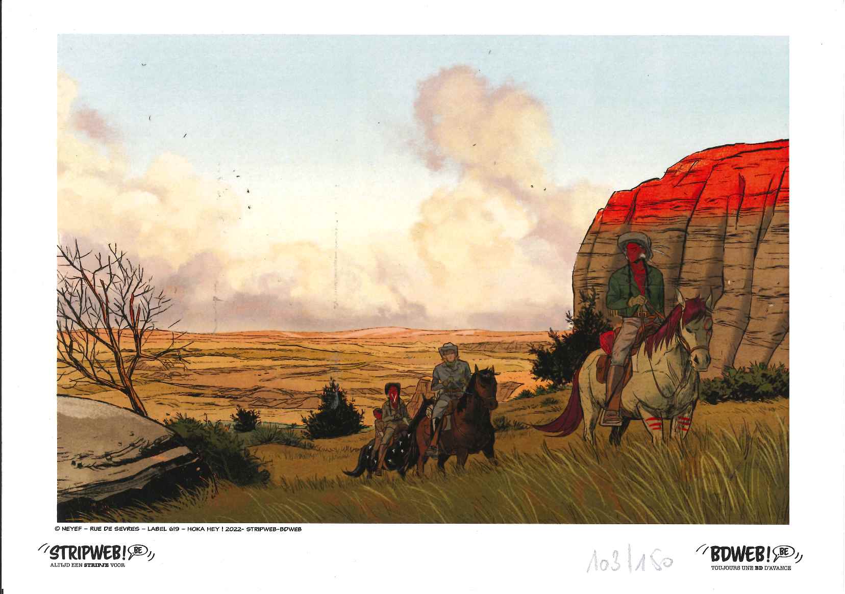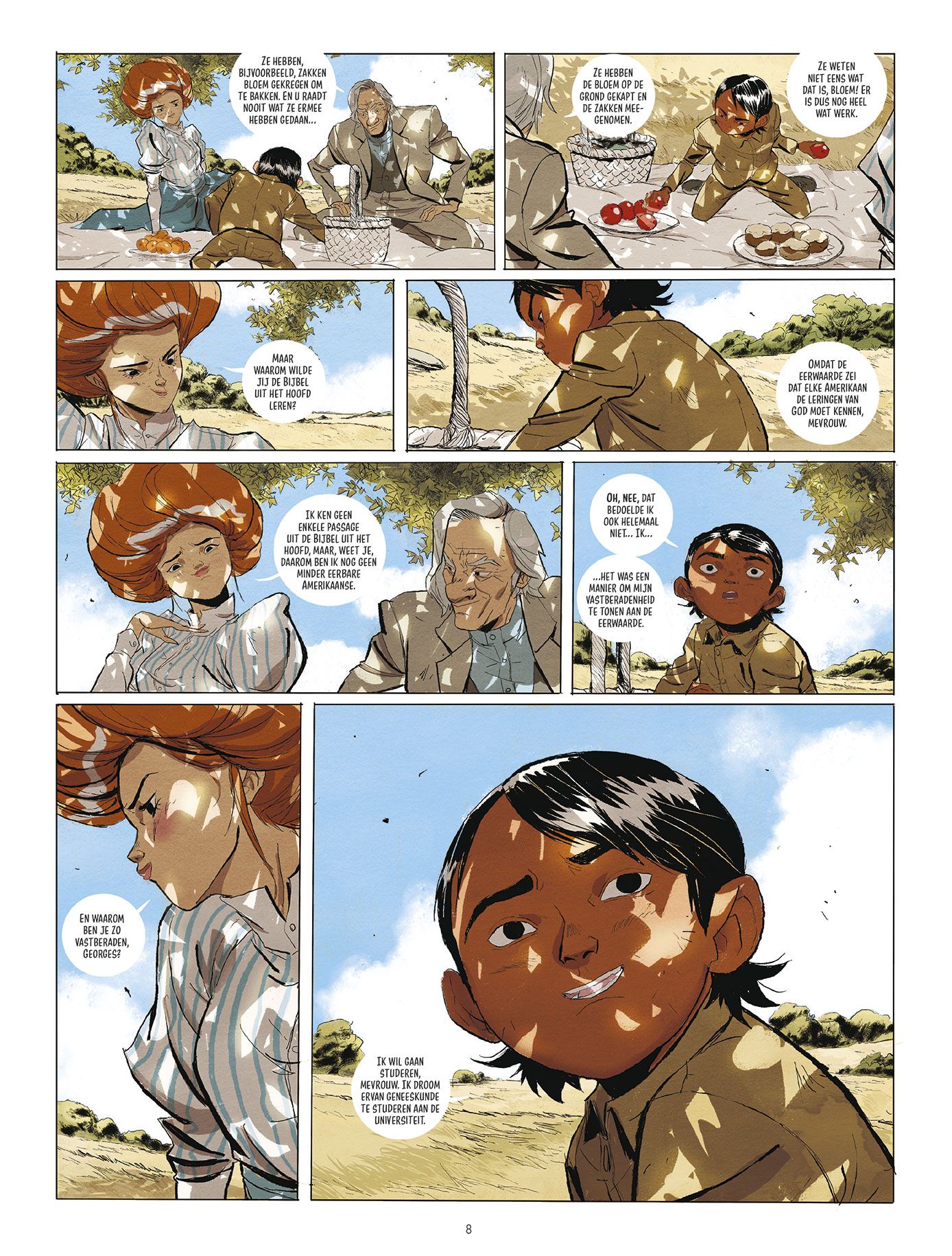 er bestaat ook een speciale stripwebversie die een bijzondere exclusieve stofomslag en 2 ex-librissen bevat . gelimiteerd op slechts 150 ex!!!!! 'Georges is een jonge Lakota. Hij wordt opgevoed door de dominee die aan het hoofd staat van zijn reservaat. De jongen is beetje bij beetje zijn roots kwijtgeraakt en droomt van een toekomst als dokter. Hij kruist het pad van Little Knife, een kille indiaan die op zoek is naar de moordenaar van zijn moeder. Samen met twee gezellen zet hij Georges’ leven op zijn kop en neemt hem mee op zijn tocht.' - Een ontzettend meeslepend verhaal dat niet voor niets op de shortlist stond voor de grootste stripprijs in Angoulême - Een verhaal over een jonge indiaan die, in een onthechte wereld, op zoek gaat naar zijn identiteit In 1900 is de oorspronkelijke bevolking van Noord-Amerika zo goed als verdwenen. De meesten zijn gestorven aan nieuwe ziektes, die waren meegebracht door kolonisten, of bij door de staat gesteunde uitroeiingen en deportaties. Georges is een jonge Lakota, opgevoed door de dominee die aan het hoofd staat van zijn reservaat. De jongen is beetje bij beetje zijn roots vergeten en droomt van een toekomst die is geïnspireerd op het Amerikaanse model. Hij kruist het pad van Little Knife, een kille, gewelddadige indiaan die op zoek is naar de moordenaar van zijn moeder. Samen met twee gezellen zet hij Georges’ leven op zijn kop en neemt hem mee op zijn tocht. Tijdens hun reis raken de man en de jongen op elkaar gesteld, ze ontdekken wat voor hen belangrijk is: de ene geeft zijn cultuur door en vindt zo zijn kalmte terug, de andere herontdekt zijn identiteit en zijn afkomst.