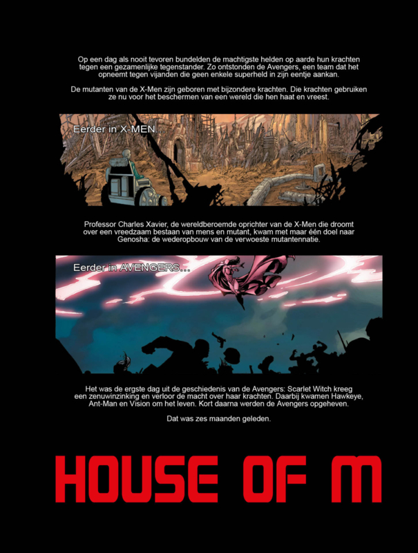 Compleet verhaal in 3 delen DIT IS HET HUIS VAN M De Avengers en de X-Men moeten beslissen over het lot van Scarlet Witch. Haar mutante krachten verscheuren de realiteit en professor Charles Xavier is bang dat hij haar straks niet meer kan helpen. Haar vader Magneto en haar broer Quicksilver zien het met lede ogen toe... maar dan wordt de wereld overspoeld door een golf wit licht. En van het ene op het andere moment is alles anders!
