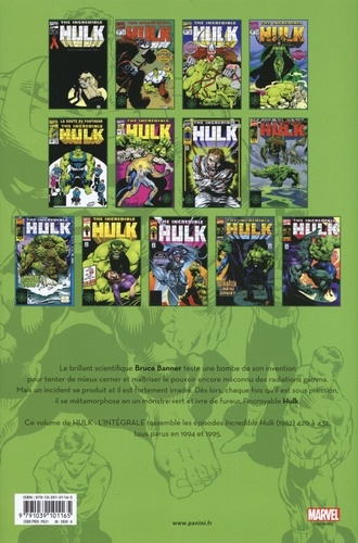 Le brillant scientifique Bruce Banner teste une bombe de son invention pour tenter de mieux cerner et maîtriser le pouvoir encore méconnu des radiations gamma. Mais un incident se produit et il est fortement irradié. Dès lors, chaque fois qu'il est sous pression, il se métamorphose en un monstre vert et ivre de fureur, l'incroyable Hulk. Ce volume de Hulk : l'integrale rassemble les épisodes Incredible Hulk (1962) 420 à 432 tous parus en 1994 et 1996.