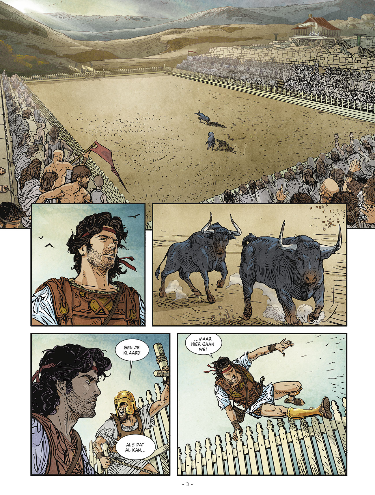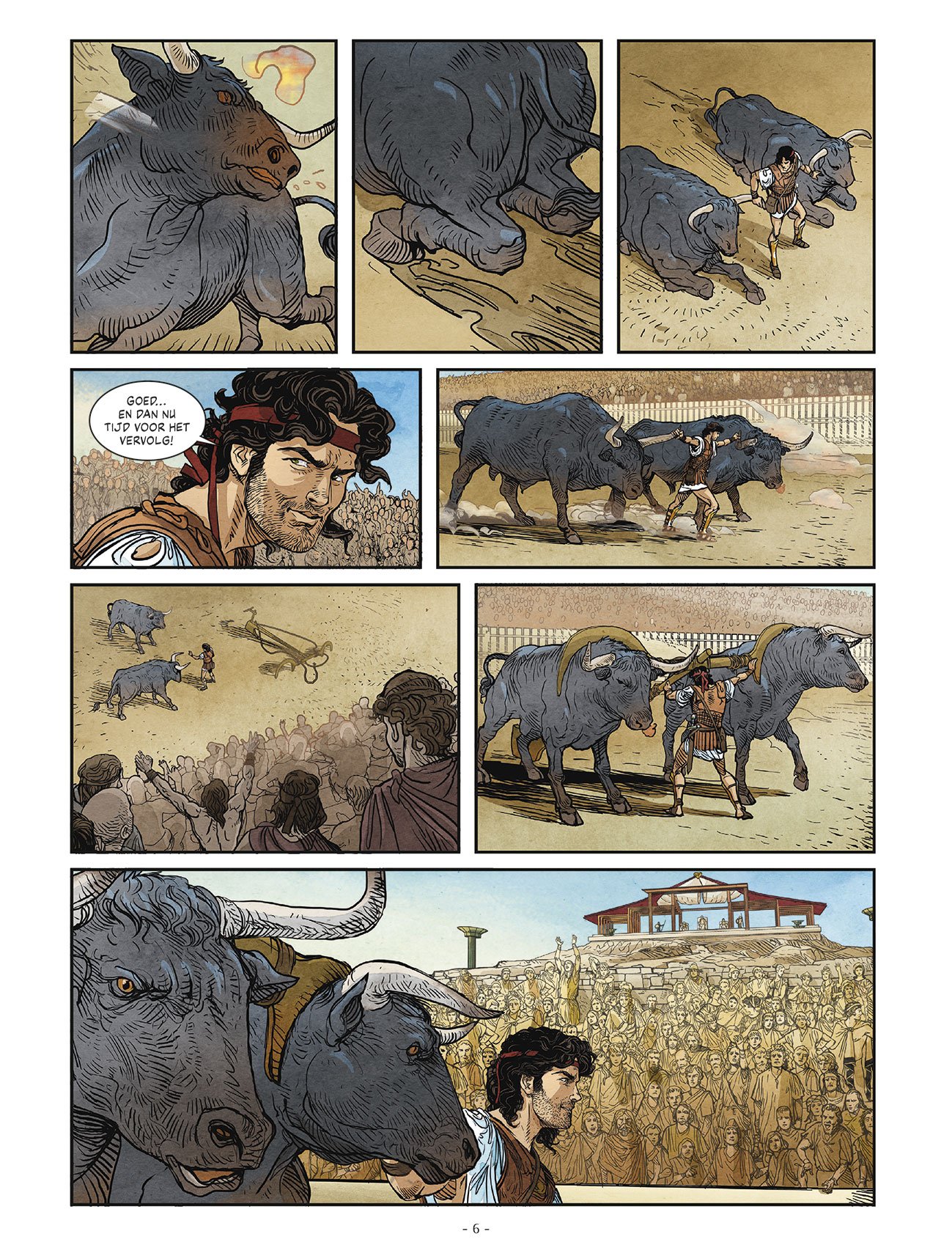 Gemiddelde score 4 / 5Op een schapenvelletje Iason en zijn Argonauten zijn nog steeds op zoek naar het legendarische gulden vlies (een gouden ramsvel) en landen op Kolchis. Hier krijgt de flegmatieke held van koning Aietes weer drie opdrachten voorgeschoteld (een rode draad doorheen de Griekse mythes blijkbaar, zie bijvoorbeeld ook Herakles en Theseus) die haast onmogelijk tot een goed einde zijn te brengen. Gelukkig heeft koningsdochter Medeia een oogje op de knappe Iason (ook een vaste waarde bij de Grieken, zie bijvoorbeeld ook de hopeloos verliefde Ariadne in de Minotaurusavonturen op Kreta) en zal ze met haar magische trukendoos de lepe valstrikken van papalief omzeilen. Met dit derde deel zit de queeste van Iason erop, al doet het extra dossier vermoeden dat er nog wel wat te vertellen valt over de man en zijn niet zo koosjere eega. Vind je dat er hier al een killing overkill is, de latere exploten van Medeia degraderen dit album tot een braaf mythisch tussendoortje. Tja, we blijven de loftrompet steken over deze conceptreeks De Wijsheid van Mythes. De auteurs blijven in een strak tempo de klassieke verhalen hertalen, maar nemen er gelukkig steeds voldoende tijd voor. De scenario’s van Clotilde Bruneau zijn steeds to-the-point en Alexandre Jubran steekt in dit drieluik de juiste dosis dynamiek in zijn tekeningen. Een blik op de webstek van Glénat toont ons dat conceptbewaker Luc Ferry nog lang niet uitverteld is. De oude Grieken legden hun mythologische lat nu eenmaal hoog en hadden een aanzienlijke output aan godenverhalen!