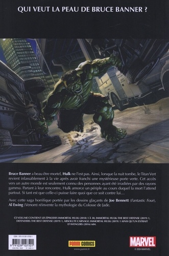 QUI VEUT LA PEAU DE BRUCE BANNER ? Bruce Banner a beau être mortel, Hulk ne l'est pas. Ainsi, lorsque la nuit tombe, le Titan Vert revient inlassablement à la vie après avoir franchi une mystérieuse porte verte. Cet accès vers un autre monde est seulement connu des personnes ayant été irradiées par des rayons gamma. Partant à leur rencontre, Hulk amorce un périple au cours duquel la mort l'attend partout. Si tant est que celle-ci puisse faire quoi que ce soit contre lui... Avec cette saga horrifique portée par les dessins glaçants de Joe Bennett (Fantastic Four), Al Ewing (Venom) réinvente la mythologie du Colosse de Jade.