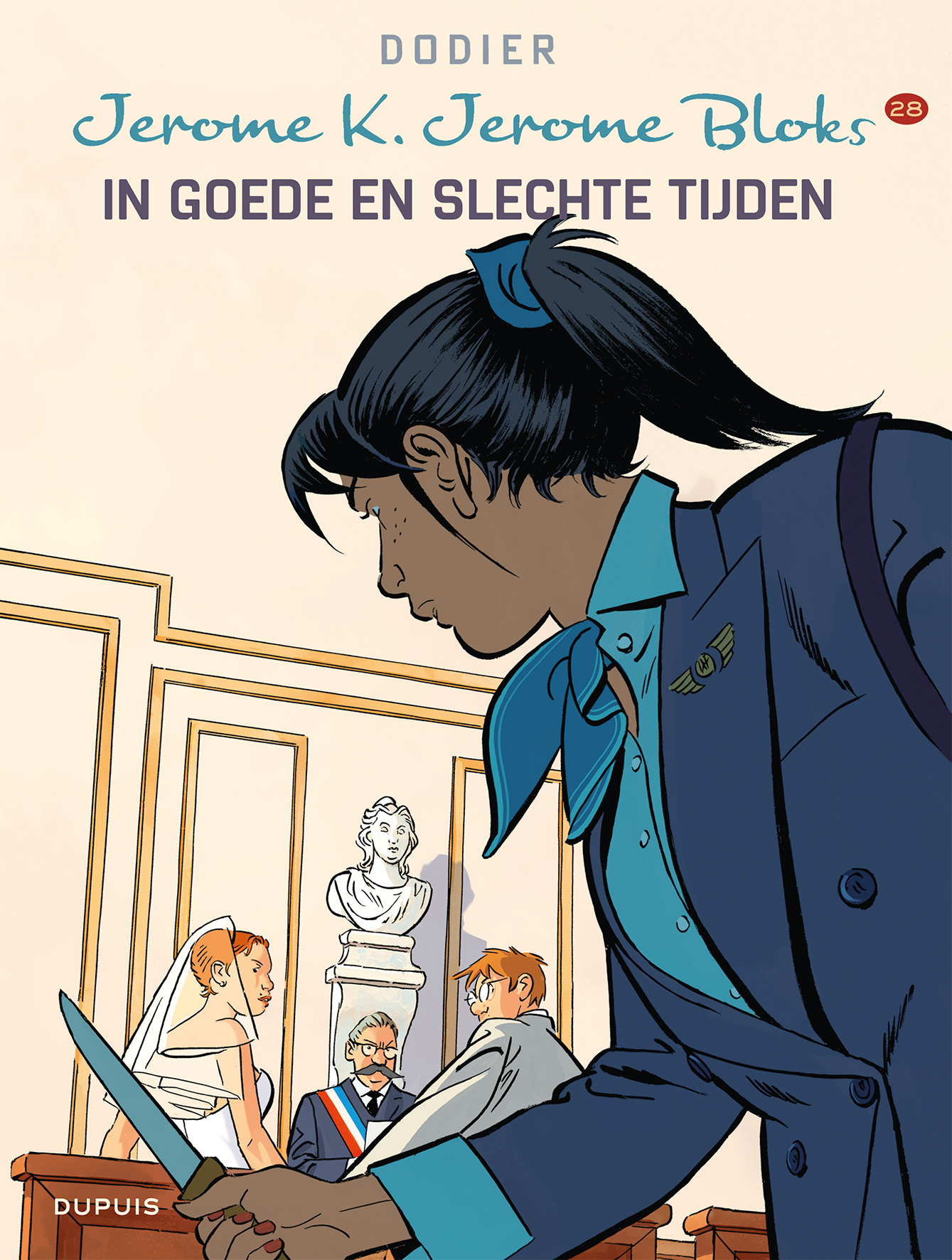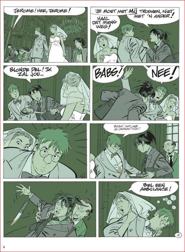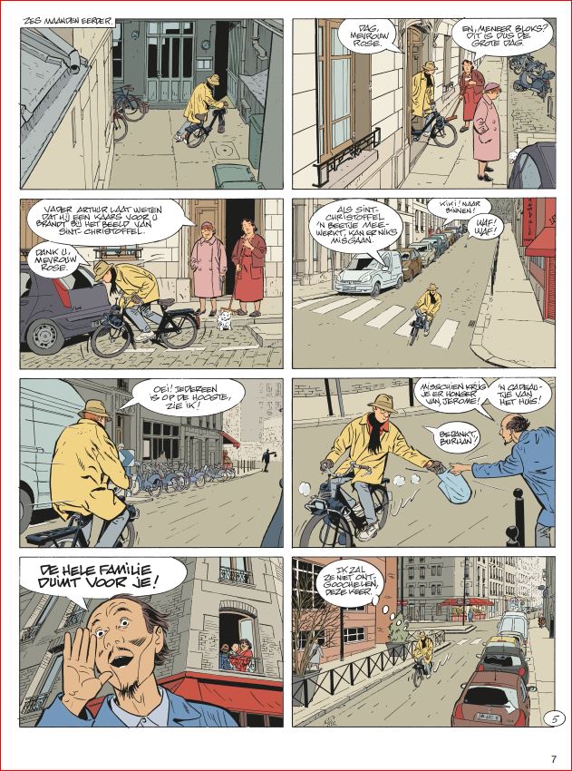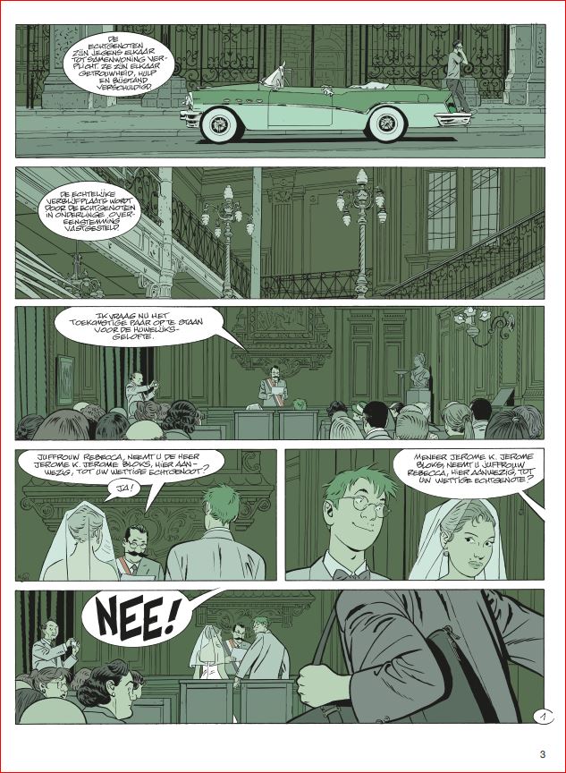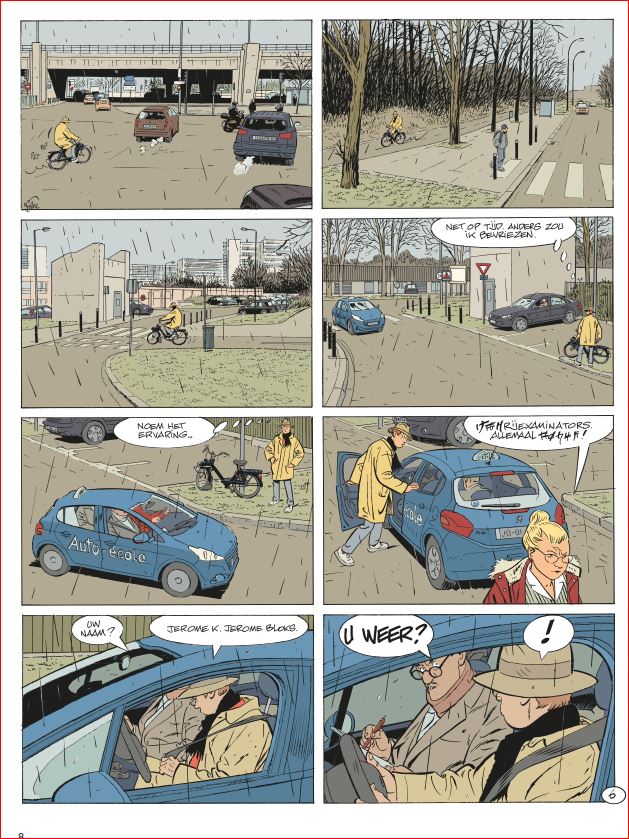 Gemiddelde score 5 / 5Doordachte perfectie Als de reeks Jerome K. Jerome Bloks zou moeten eindigen, wat zou u nog absoluut kwijt willen in dat deeltje? DODIER: “Het huwelijk van Babette en Jerome! Voordien gaan die nooit trouwen. Maar voor alle duidelijkheid: ik heb helemaal geen haast en zin om nu al te stoppen met de reeks. Ik heb nu zesentwintig albums getekend in zevenendertig jaar. Ik ben er nu tweeënzestig. Aan dat tempo haal ik net nog de vijftig albums.” (lacht) Dat vertrouwde Alain Dodier ons toe in dit diepte-interview uit begin 2019. En wat gebeurt er amper twee albums later? Op de cover zien we onze geliefde detective voor het altaar staan met de knappe rosse Rebecca. Iets wat het Oost-Europese bloed van Babette serieus laat koken. Wie denkt dat dit een vertellinkje wordt van de sympathieke mensenvriend die uit altruïsme even met een vreemde huwt voor een verblijfsvergunning, heeft het mis. Een JKJ is geen aflevering van Thuis of Goede Tijden Slechte Tijden. Zoals steeds kiest Dodier niet voor ongeloofwaardige effectzoekerij, maar wel voor een lokaal verhaal dat druppelsgewijs wordt opgebouwd en waar geen speld tussen te krijgen is. Nochtans was het schrikken. De openingspagina’s zijn van een ongeziene heftigheid. De tijd dat een Jerome K. Jerome Bloks opende met een moord op een kanarievogel ligt ver van ons af. Gelukkig viel alles snel terug op zijn Jeromes. Onze held die al sinds deel 8 probeert zijn rijbewijs te halen, onderneemt een nieuwe poging. Een merkwaardige deze keer! De voorbije twintig jaar kreeg Dodier tijd en ruimte om zijn ding te doen. De strips zijn er alleen maar kwalitatiever op geworden. Dodier vertelt zijn verhaal in geuren en kleuren. Hij gebruikt subtiele non-verbale communicatie of hij laat net dat ene woordje vallen om zijn personages extra diepgang te geven. Deze keer willen we maar al te graag spitten in de jeugdjaren van kruidenier Durham. Maar zoals het past in de lineair opgebouwde verhaallijnen van Jerome K. Jerome Bloks zullen we ook hier naar kunnen fluiten. Grafisch is Dodier de meester van de nutteloze prentjes geworden. Elke actie, hoe klein ook, verdient voor hem een apart prentje. Het hoogtepunt van In Goede en Slechte Tijden is een volledige pagina waarop je Jerome via de trapleuning naar beneden ziet glijden. Negen prentjes pure perfectie. Helaas slaat de slinger in dit deel te fel door. Ondanks de 72 pagina’s zijn er ettelijke wafelijzerpagina’s met tien of meer prentjes per pagina. Dit komt bij momenten te beklemmend over. Eigenlijk zou deze man honderd pagina’s moeten krijgen... en eindelijk eens de grote prijs van Angoulême mogen winnen. Dan hoeft het iconische prijsbeeldje niet meer gebruikt te worden om iemand neer te meppen. Ach, ooit zal hij wel bekroond worden, zeker? Want... Jerome K. Jerome Bloks is en blijft een reeks waarvoor superlatieven zijn uitgevonden. brons ssz
