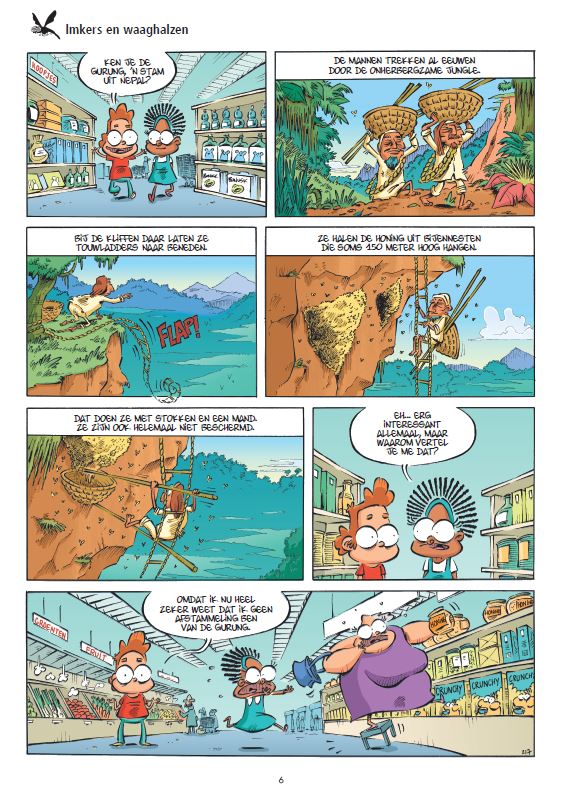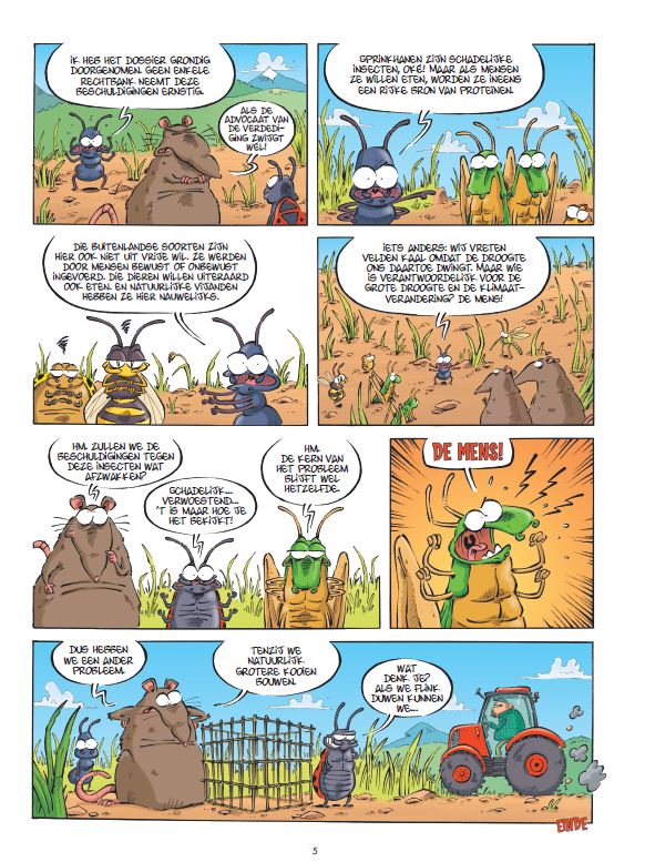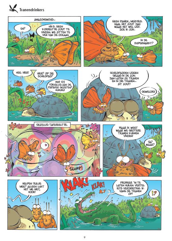 Gemiddelde score 4 / 5Maak kennis met de tijgermug, de snuitkevers, de aardhommel, de regenboogsprinkhanen, de nachtpauwoog en nog vele andere zespotige, ongewervelde dieren. Wist je al dat bijen kunnen tellen en zelfs ‘surfen’? Of dat vliegen geen mond hebben en alleen maar vloeibare dingen kunnen opzuigen? Daarom spuwen vliegen eerst slijm op het voedsel. Je laat dus best geen vlieg op je eten zitten… Wist je al dat er een vlinder is die geen mond heeft? De nachtpauwoog leeft hierdoor heel kort. Hij teert op de vetreserve die hij heeft opgebouwd toen hij een rups was. En wat zijn karate-kakkerlakken of wat is een ‘madentsunami’? Na de reeks over de dino’s, is er nu dus ook deze kleurrijke stripreeks over insecten die ondertussen al uit zes delen bestaat. Bovendien is er ook een soortgelijke reeks uit over diepzeebewoners. Leuk voor kinderen die fan worden na het lezen van één deel. Zij kunnen via het serielezen gewoon verder lezen, wat dan ook weer leesbevorderend werkt! Cazenove & Vodarzac geven in deze biijzzzzzondere strip heel wat nuttige weetjes over insecten. Steeds met een humoristische noot, zodat alles een komisch geheel krijgt. Bij de 1-paginagags kan je ook handige steekkaarten terugvinden over insecten waar je de orde, familie, geslacht en de soort kan terugvinden, maar waar je ook een beschrijving van het dier krijgt en enkele sterke punten. Het tekenwerk van Nathan Cosby geeft persoonlijkheid aan de insecten. De personages zijn zeer gedetailleerd getekend en er ontstaat een sprekende dynamiek tussen de insecten onderling. Elk insect wordt op een amusante en komische manier weergegeven en bevat een levendige gezichtsuitdrukking. De meest kenmerkende trekken van de insecten worden overdreven weergegeven zodat de lezer een humoristische voorstelling verkrijgt. De illustraties zijn dus rijk aan details en hebben een helder kleurenpalet! Er zitten zelfs enkele paginagrote illustraties bij, wat de strip extra aantrekkelijk maakt. Leuk extraatje achteraan de strip is het pedagogisch dossier over wat insecten voor de landbouw betekenen. Ga mee op een boeiende en fascinerende reis door de insectenwereld en leer meer over deze zespotige dieren. Kleurrijke, humoristische & leerrijke strip voor insectenliefhebbers vanaf 8 jaar!