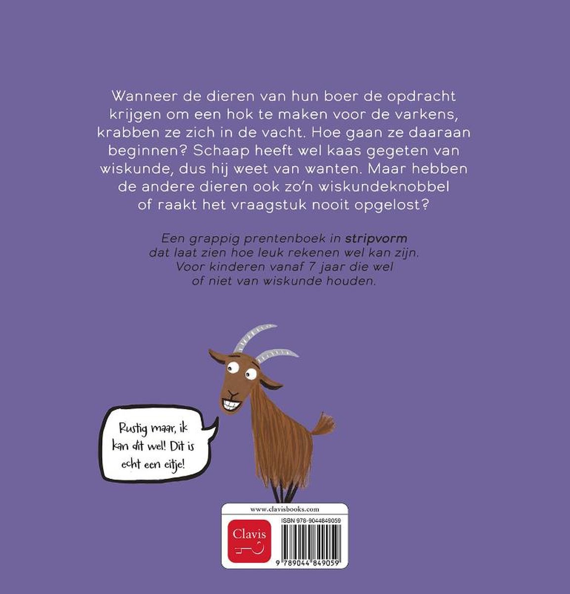 Wanneer de dieren van hun boer de opdracht krijgen om een hok te maken voor de varkens, krabben ze zich in de vacht. Hoe gaan ze daaraan beginnen? Het schaap heeft wel kaas gegeten van wiskunde, dus hij weet van wanten. Maar hebben de andere dieren ook zo’n wiskundeknobbel of raakt het vraagstuk nooit opgelost? Een grappig prentenboek in stripvorm dat laat zien hoe leuk wiskunde wel kan zijn. Voor rekenbeesten vanaf 7 jaar.