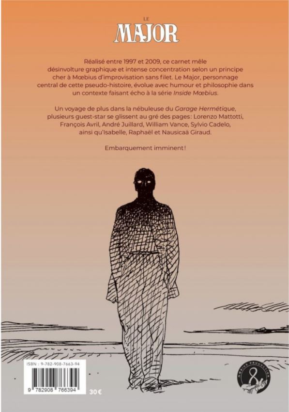Geproduceerd tussen 1997 en 2009 combineert dit notebook grafische nonchalance en intense concentratie volgens het Moebius-principe van improvisatie. De Major, het centrale personage van dit pseudo-verhaal, evolueert met humor en filosofie in een context die aansluit bij de serie Inside Moebius. Nog een reis door de nevel van de Hermetische Garagae, verschillende gaststerren glippen door de pagina's: Lorenzo Mattotti, François Avril, André Juillard, William Vance, Sylvio Cadelo, evenals Isabelle Giraud en hun kinderen, Raphaël en Nausicaä. Na de eerste 150 platen dienen zwart-wit- en kleurenafbeeldingen als bonus voor deze heruitgave met vooral inkleuring van tekeningen die dicht bij het werk van Moebius staan. Franstalig hoogte 21,5 cm op 15,5 cm 3cm dikte