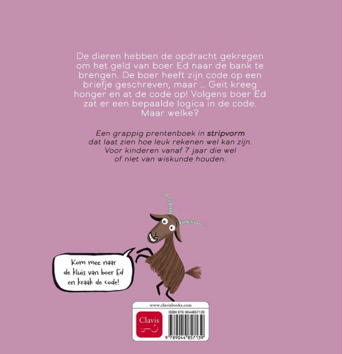 De dieren hebben de opdracht gekregen om het geld van boer Ed naar de bank te brengen. De boer heeft zijn code op een briefje geschreven, maar … Geit kreeg honger en at de code op! Volgens boer Ed zat er een bepaalde logica in de code. Maar welke? Een grappig prentenboek in stripvorm dat laat zien hoe leuk rekenen wel kan zijn. Voor kinderen vanaf 7 jaar die wel of niet van wiskunde houden.