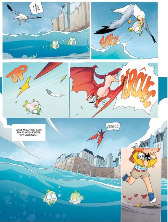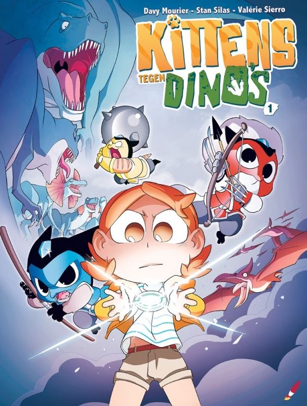 Gemiddelde score 4 / 5Niet van de poes Eva is een klein meisje dat onlangs haar verjaardag mocht vieren. Haar cadeau is fantastisch: drie kittens én een medaillon. De namen moeten met een ‘A’ beginnen, dus kiest ze voor Athena, Attila en Atom. De volgende ochtend is niemand meer te bespeuren in het pittoreske havenstadje Saint-Malo. Eva trekt eropuit en ziet militairen aan het strand staan, en de spanning is te snijden. Voor ze het weet, gebeurt het gekste dat je je ooit kunt indenken: de inwoners zijn dino’s geworden! Zo achtervolgt een T-rex Eva, die achteraf haar moeder blijkt. Gelukkig krijgt ze hulp van haar katten, die veranderen in pratende ‘Karatekittens’ en de boel op stelten zetten. Alle gekheid op een stokje in het debuutalbum van Kittens tegen... De titel alleen al triggerde onze interesse. Wat gaan kleine poesjes beginnen tegen gigantische, levensgevaarlijke dino’s? En hoe is het überhaupt mogelijk dat beide diersoorten met elkaar in contact komen? In ieder geval hebben we geen spijt dat we kennismaakten met deze gloednieuwe reeks. De manga-achtige tekenstijl vol mimiek en dynamiek, gecombineerd met het rijke kleurenpalet, zorgt ervoor dat het leven ervan afspat in deze strip. Het verhaal op zich is er ook eentje vol plottwists waarbij werkelijk alles mogelijk is. Deze reeks laat kittens in verschillende albums strijden tegen verschillende diersoorten. In dit album gaan de dino’s voor de bijl, maar in deel 2 nemen ze het op tegen eenhoorns. Het kan dus nóg gekker! SEPPE COOLS stripspeciaalzaak