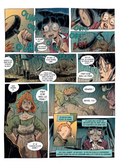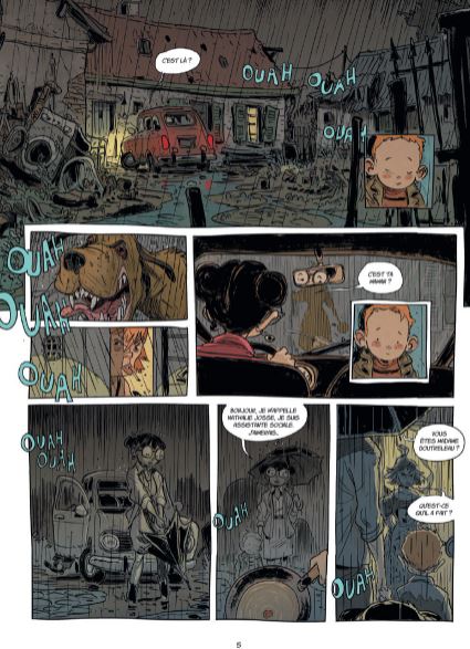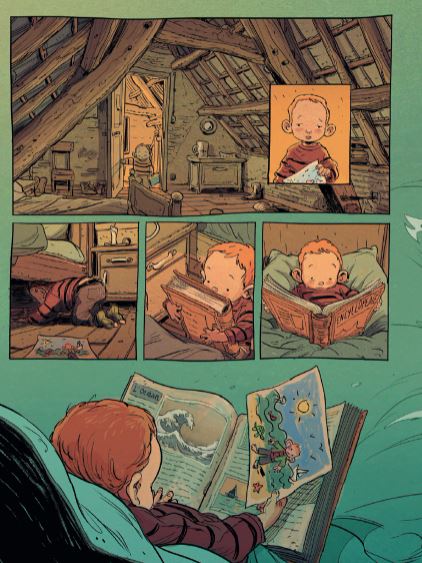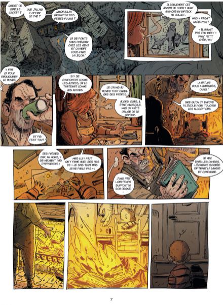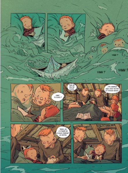 Dat onze eigenste Vlaming Stedho graag eens een boek verstript weten we intussen allemaal. Steven Dhondt illustreerde al een tal van Marc de Bel boeken zoals Pit en Puf, Getekend, Marc de Bel, De Kriegels en nog meer diverse kinderstrips en -boeken. Jean-Claude Mourlevat, laureaat van de Astrid Lindgren Memorial, zag dit jaar alsook zijn Nobelprijs-boek 'Oceaankind' voor kinderliteratuur op meesterlijke wijze omgetoverd als strip door Stedho. Max L'Hermenier tekende voor het scenario. Uitgeverij Daedalus viert intussen zijn 15 jarig bestaan en speciaal om dit te vieren heeft Steven Dhondt een ex libris getekend en gesigneerd, met daarop een paar van hun markantste stripfiguren. Deze ex libris telt slechts 250 exemplaren en is slechts beschikbaar met de hardcover versie van 'Oceaankind'. Is de strip een beetje te pruimen ? Absoluut ! Alles klopt in dit mooie album, zowel het scenario als de illustraties. Het verhaal is nochtans heel simpel maar toch bedrieglijk eenvoudig. Op een nacht wekt de zwijgzame 10-jarige Yann in volle paniek zijn zes oudere broers, allemaal tweelingen. Yann is ervan overtuigd dat hun vader hen morgenvroeg allemaal zal vermoorden. De zeven broers vluchten op kousenvoeten de nacht in op weg naar betere oorden. Dé droombestemming van de kleine Yann blijkt de oceaan te zijn en de broers trekken dat ook richting het Westen, naar zee. Een avontuurlijke 'roadtrip' meldt zich aan maar hun tocht naar de zilte badplaats gaat uiteraard niet over rozen. Honger, dorst, ontbering, vermoeidheid en kou worden jammerlijk hun metgezellen tijdens deze moeizame route. Enkele misverstanden maken het scenario kompleet en dat heb ik het nog niet eens gehad over het tekenwerk van Stedho... De illustraties passen wonderwel met het verhaal. Er zitten veel zwijgzame momenten in verweven en daar hoort überhaupt tekenwerk bij gespijsd met de nodige poëzie en Stedho levert dit op magistrale wijze. Het camera werk is ook van de bovenste plank zodat de lezer zich geen seconde kan vervelen. Een betere kleurkeuze kon hier gewoonweg niet gemaakt worden en toen ik uit nieuwsgierigheid eens ging piepen wie daar verantwoordelijk voor was kwam ik tot de verassende conclusie dat dit alsook het knappe werk was van Stedho. Chapeau ! Heel de sfeer van deze verstripte roman deed mij een beetje denken aan de betere strips van Ragebol door de geweldige Frank Pé, zoals 'De droom van de walvis' (1987) en 'De beeldhouwers van het licht' (1987). Daarin vinden we alsook deze poëtische stijl met bijpassend kleurenpalet terug. 'Oceaankind' is een sprookjesachtig Klein Duimpje-verhaal in een nieuw kleedje. Voor mij alvast een aangename verassing en een dikke aanrader. (Nibs)