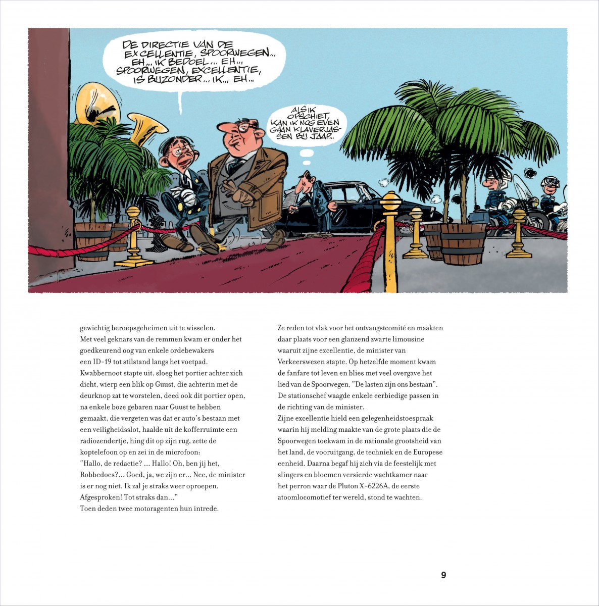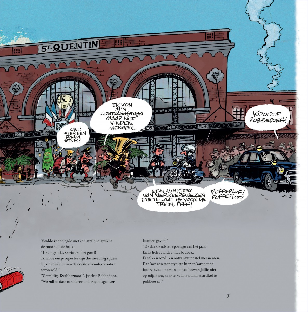 Kwabbernoot maakt een reportage over een gloednieuwe atoomtrein. Guust vergezelt hem als assistent en slaagt er met zijn legendarische klungeligheid al snel in om de locomotief aan het draaien te brengen ... Bovendien laat hij de deur van de machinistencabine, die enkel van binnenuit kan worden geopend, in het slot vallen. De onbemande locomotief dendert aan hoge snelheid over het Europese spoornet. Aan boord? Kwabbernoot, Guust, een treinbegeleider van de vakbond, een idiote stationschef en een minister met een zwak voor champagne. Alle hoop rust op Robbedoes om de trein tot stilstand te brengen. Dit avontuur is geschreven in de vorm van een hoorspel dat de Waalse openbare omroep RTBF in 1963 in de ether gooide. Het verscheen in 1964 ook in het weekblad Spirou. Het is geschreven en geïllustreerd door drie grote stripmakers van de school van Marcinelle: Yvan Delporte, Jidéhem en natuurlijk André Franquin, die toen ook Robbedoes & Kwabbernoot en Guust tekende.