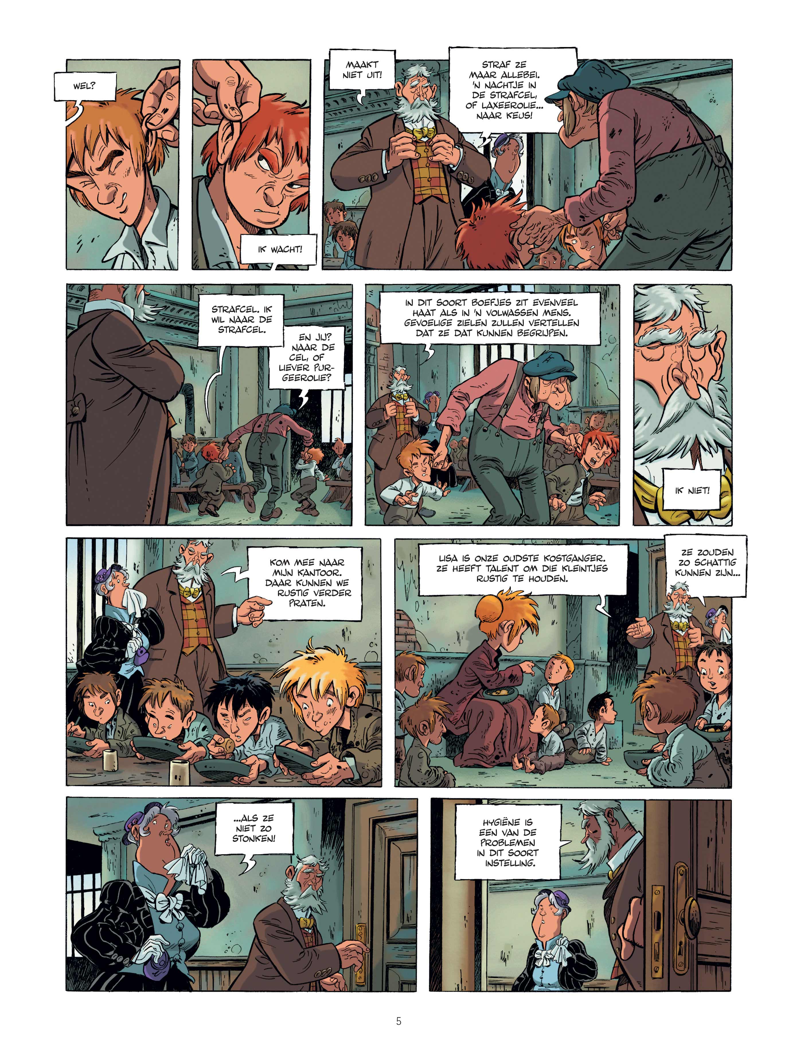 Tussen 1854 en 1929 bepaalde de Orphan Train Movement het lot van ettelijke duizenden straatkinderen aan de oostkust van de Verenigde Staten. Alleen al in de straten van New York leefden zo'n 20.000 weeskinderen van kleine diefstallen en bedelen. De overheid dwong hen alle banden met hun verleden door te knippen en zette ze op een trein naar het Westen dat kampte met een gebrek aan goedkope werkkrachten en oogappels om lief te hebben ... In De Wezentrein leren Jim en Harvey elkaar kennen aan boord van zo'n konvooi. Het wordt een lange reis vol vriendschap, solidariteit ... maar ook verraad. Want sommigen zijn tot alles bereid om in een goed adoptiegezin terecht te komen. Van de scenarist van Karma Salsa en de tekenaar van De legende van het Wisselkind. Met een dossier over de echte geschiedenis van de Orphan Train Riders.