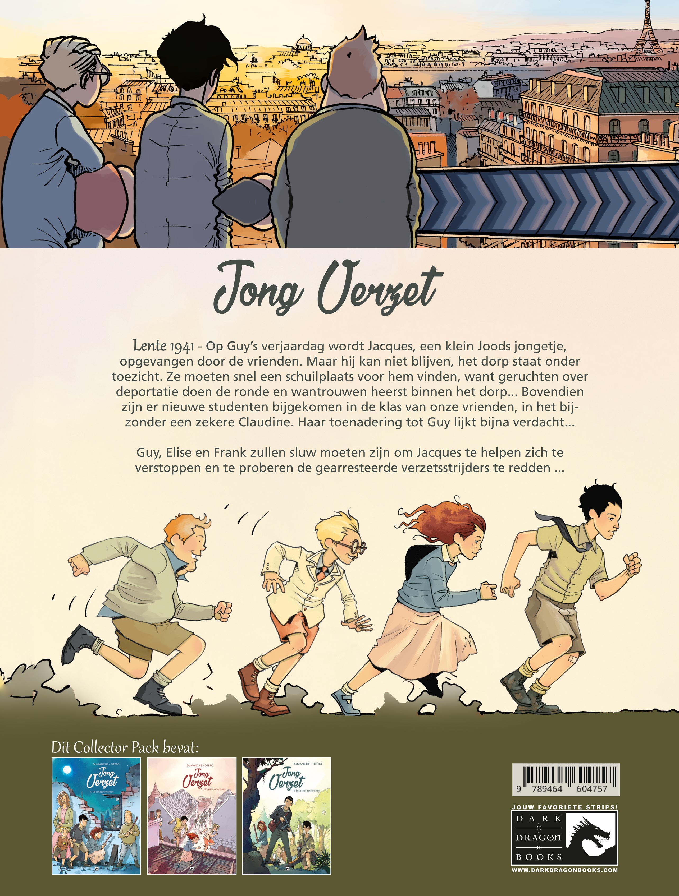 Verwacht maart 2024 Lente 1941 - Op Guy’s verjaardag wordt Jacques, een klein Joods jongetje, opgevangen door de vrienden. Maar hij kan niet blijven, het dorp staat onder toezicht. Ze moeten snel een schuilplaats voor hem vinden, want geruchten over deportatie doen de ronde en wantrouwen heerst binnen het dorp... Bovendien zijn er nieuwe studenten bijgekomen in de klas van onze vrienden, in het bijzonder een zekere Claudine. Haar toenadering tot Guy lijkt bijna verdacht... Guy, Elise en Frank zullen sluw moeten zijn om Jacques te helpen zich te verstoppen en te proberen de gearresteerde verzetsstrijders te redden ... Jong Verzet Collector Pack 2 Deel 4-5-6